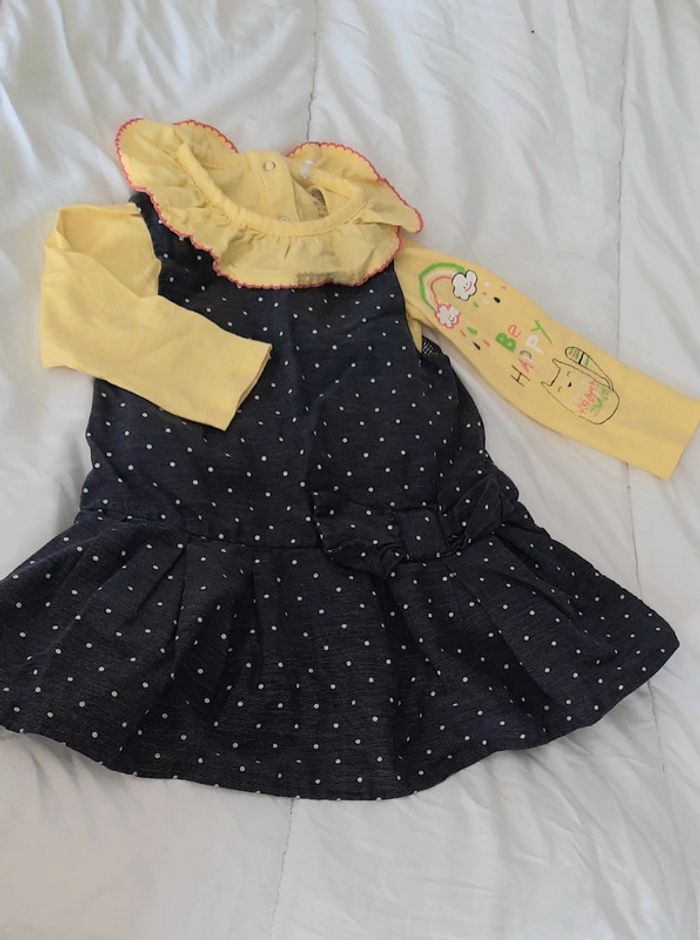 Robe bleu à poits avec nœud à la taille T shirt jaune manche longue