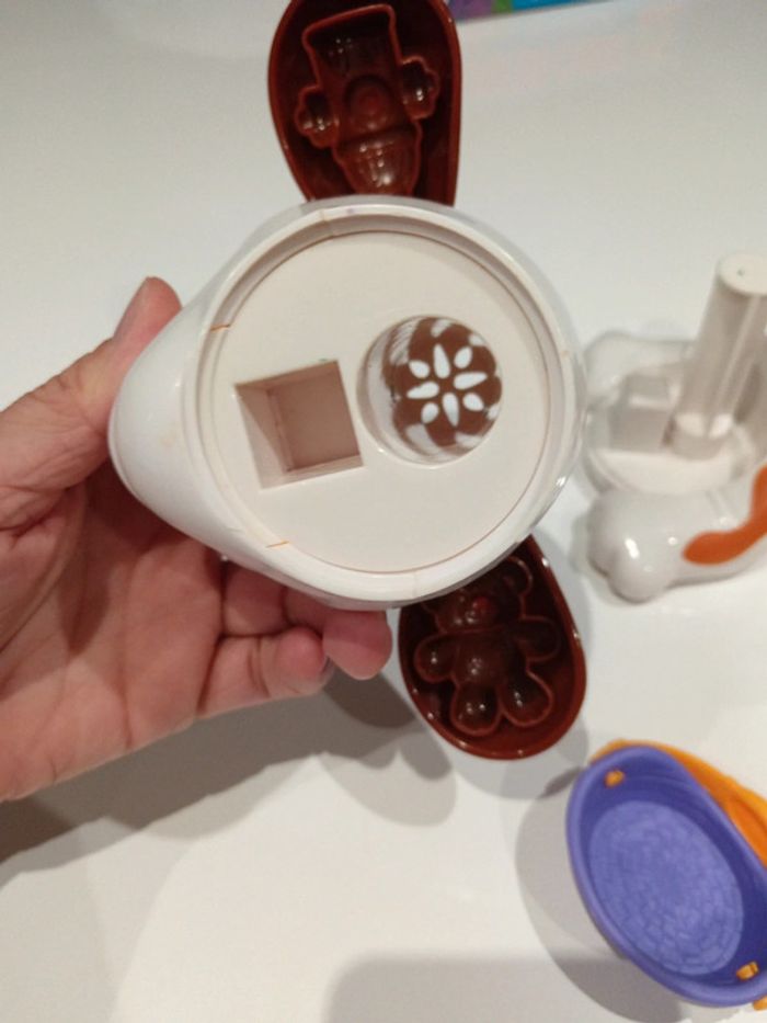 #audrey_94450_jouets En mettant de la pâte à modeler et en appuyant sur la tete et la bouche de la pate à modeler sort une langue et les cheveux