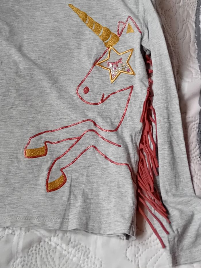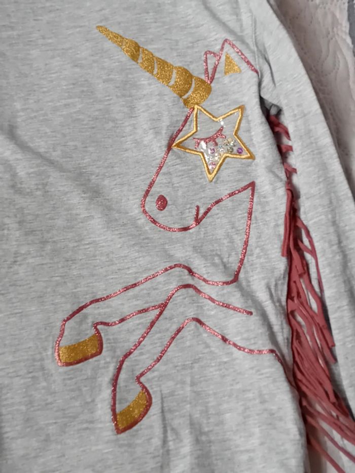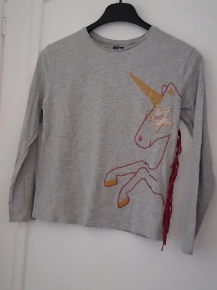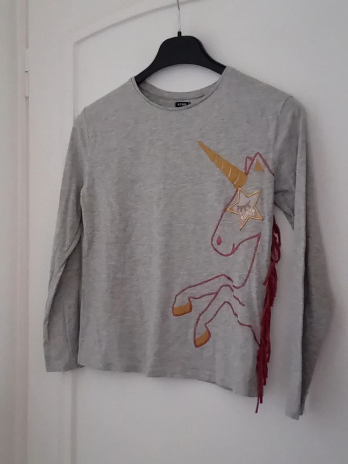 Tee-shirt manches longues en coton et viscose motif licorne avec paillettes etoile en plastique avec des sequins franges sur le côté longueur 46 cm largeur aisselles à aisselles 38 cm largeur épaules 36 cm longueur manches 46 cm juste porté une ou deux fois en très bon état n hésitez pas à faire un lot dans mon dressing pour bénéficier d une réduction #midole #midoleenfant #midolefille #midolefille10ans #Tee-shirt #kiabi #fille10ans