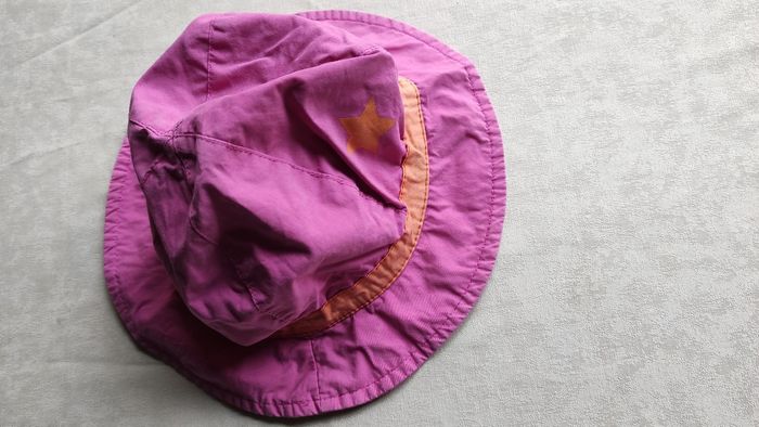 Joli chapeau bob rose avec bande et étoile ton orange. A servi mais peut largement avoir une deuxième vie. Taille 52 cm