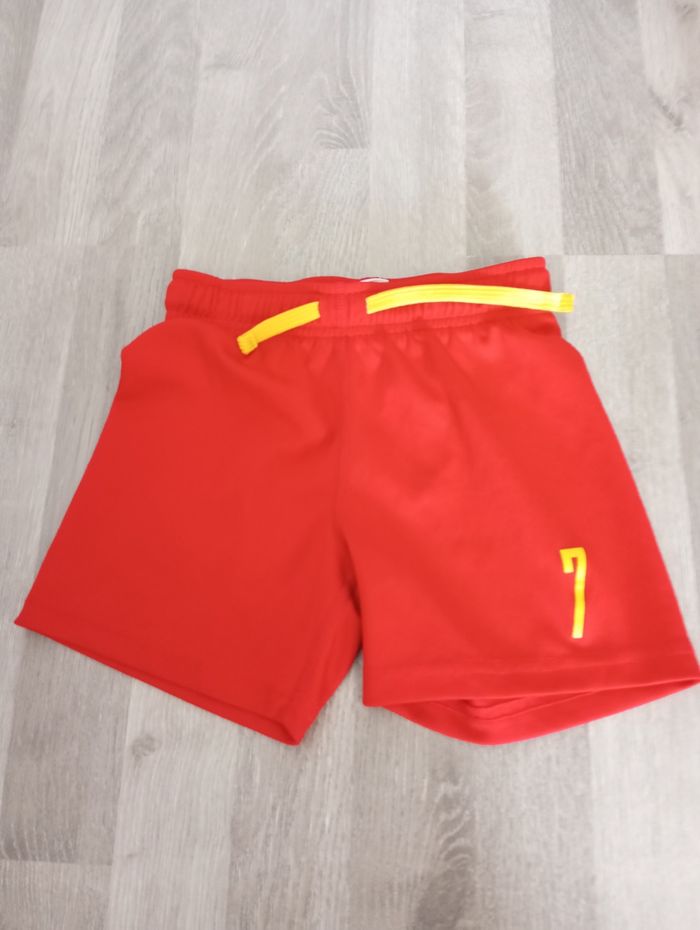 Short de foot, marque H&M, taille 2-4 ans, 98-104 cm. Il a quelques accros, voir photo, mais reste en bon état.