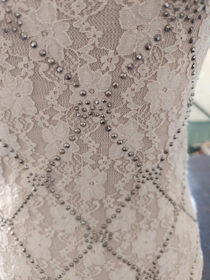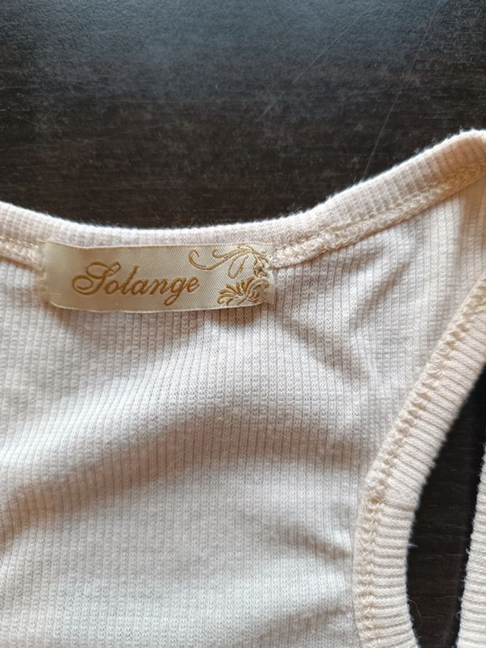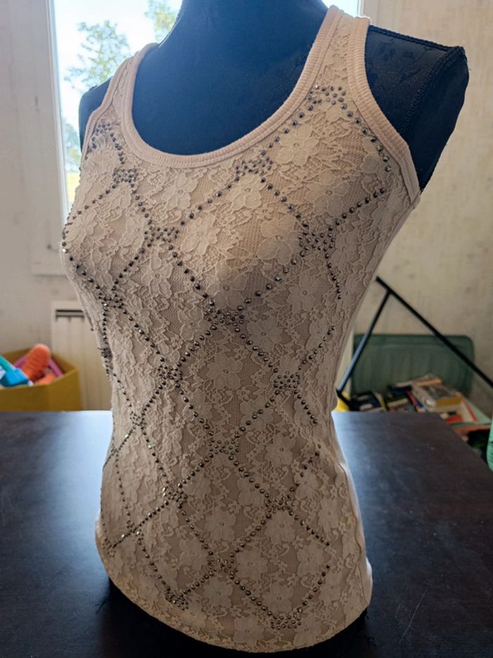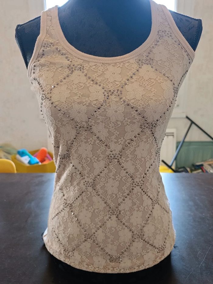 Débardeur SOLANGE Beige Effet guipure avec strass argentés sur le devant Dos nageur Larges bretelles Doublé sur l'avant pour éviter la transparence 100% Polyester TAILLE UNIQUE TRES BON ETAT Allez voir mes autres ventes!