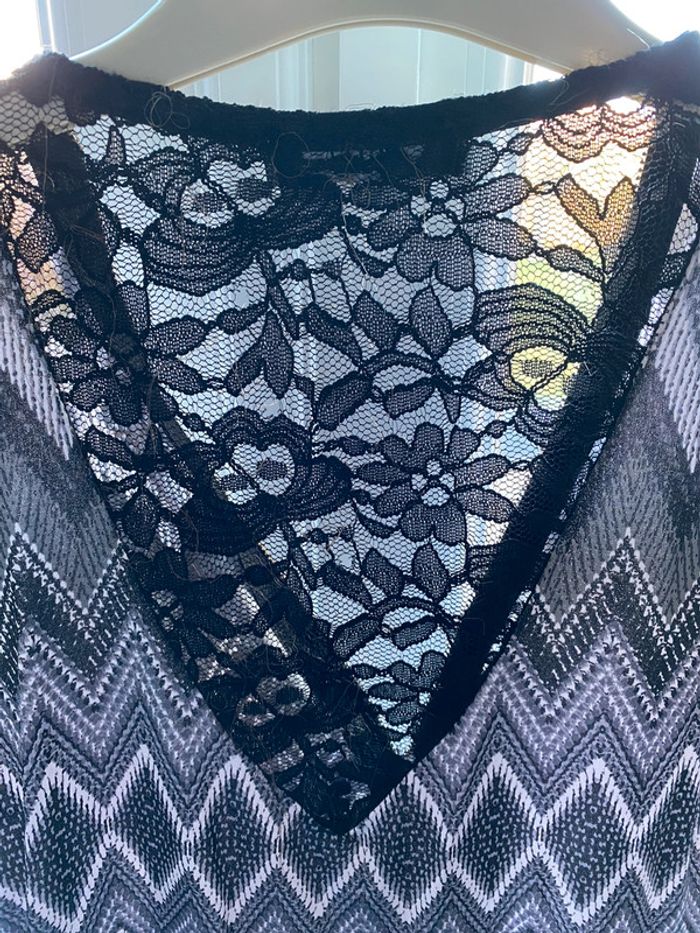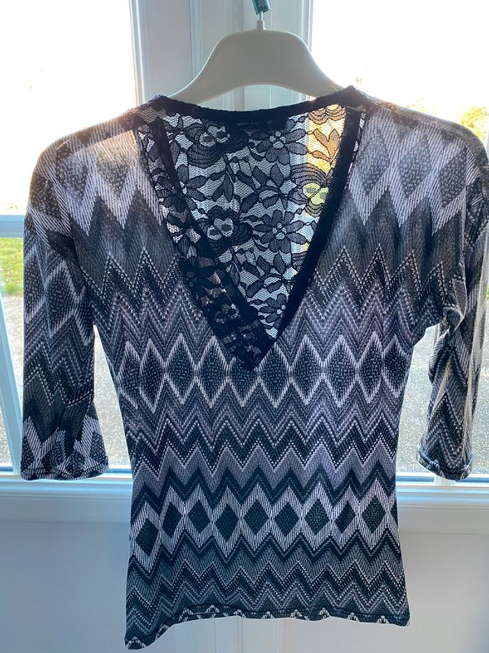 Haut chic graphique avec dentelle dans le dos fermeture éclair devant Porté 2/3 fois