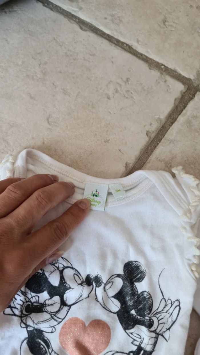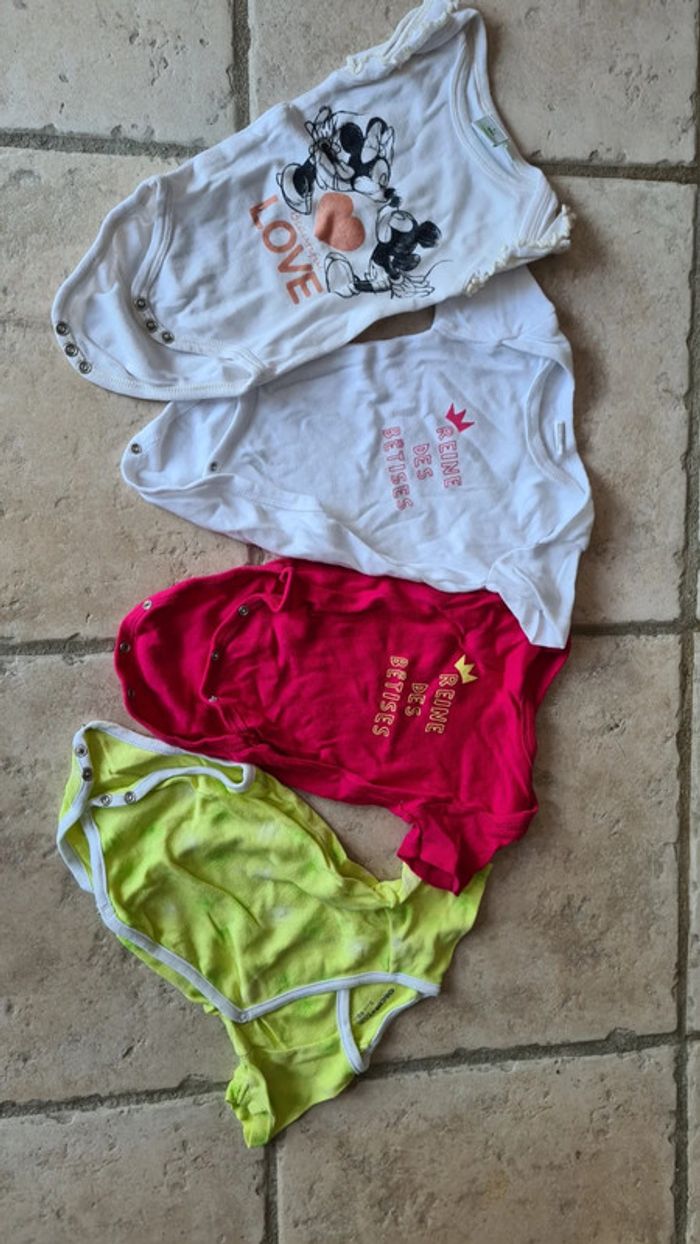 Lot de 4 bodies Un blanc avec minie (marque disney) 1 vert (marque orchestra) 1 rose fushia (marque tissyia) 1 blanc (marque tissaya) Taille 3 mois