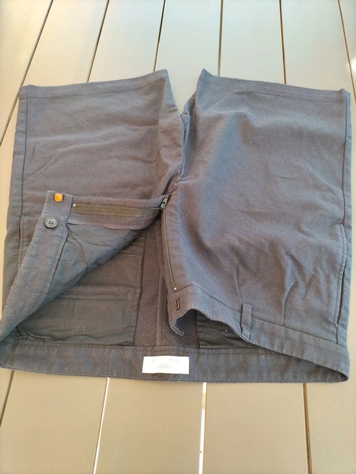 Short marine taille 44 Aspect gaufré. Taille dimensions 44 cm de largeur 2 poches latérales Il n'a plus son étiquette composition. En très bon état Ikks