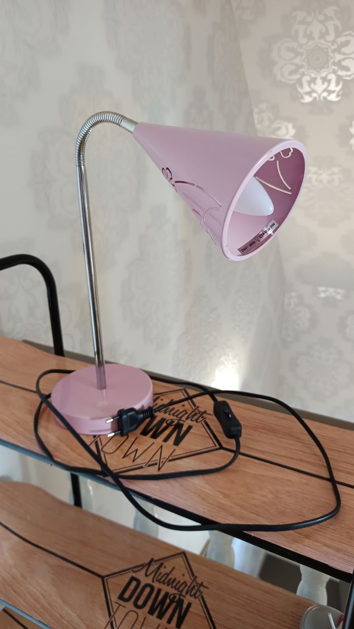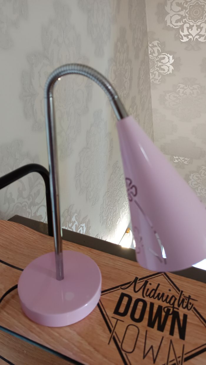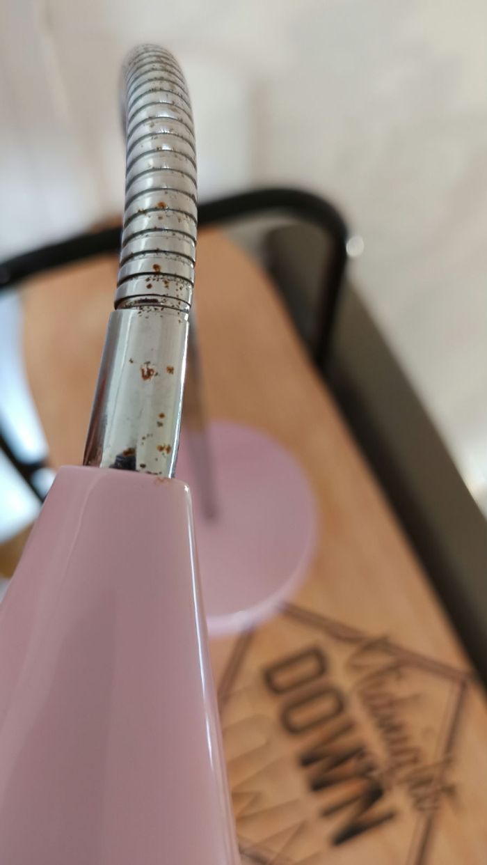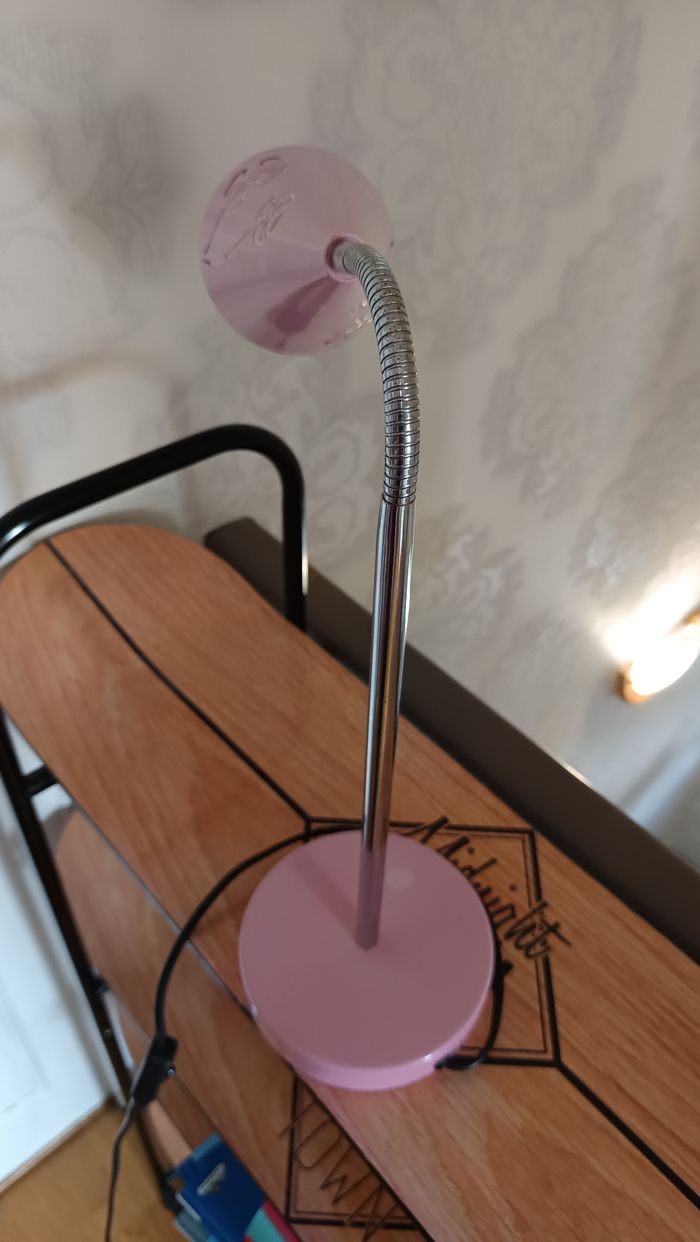 Lampe de chevet ou bureau de coloris rose pâle et argenté Le bras est flexible pour diriger la lampe Fonctionne par branchement Hauteur environ 40 cm Ampoule fournie Très bon état (juste un point de rouille presque non visible)