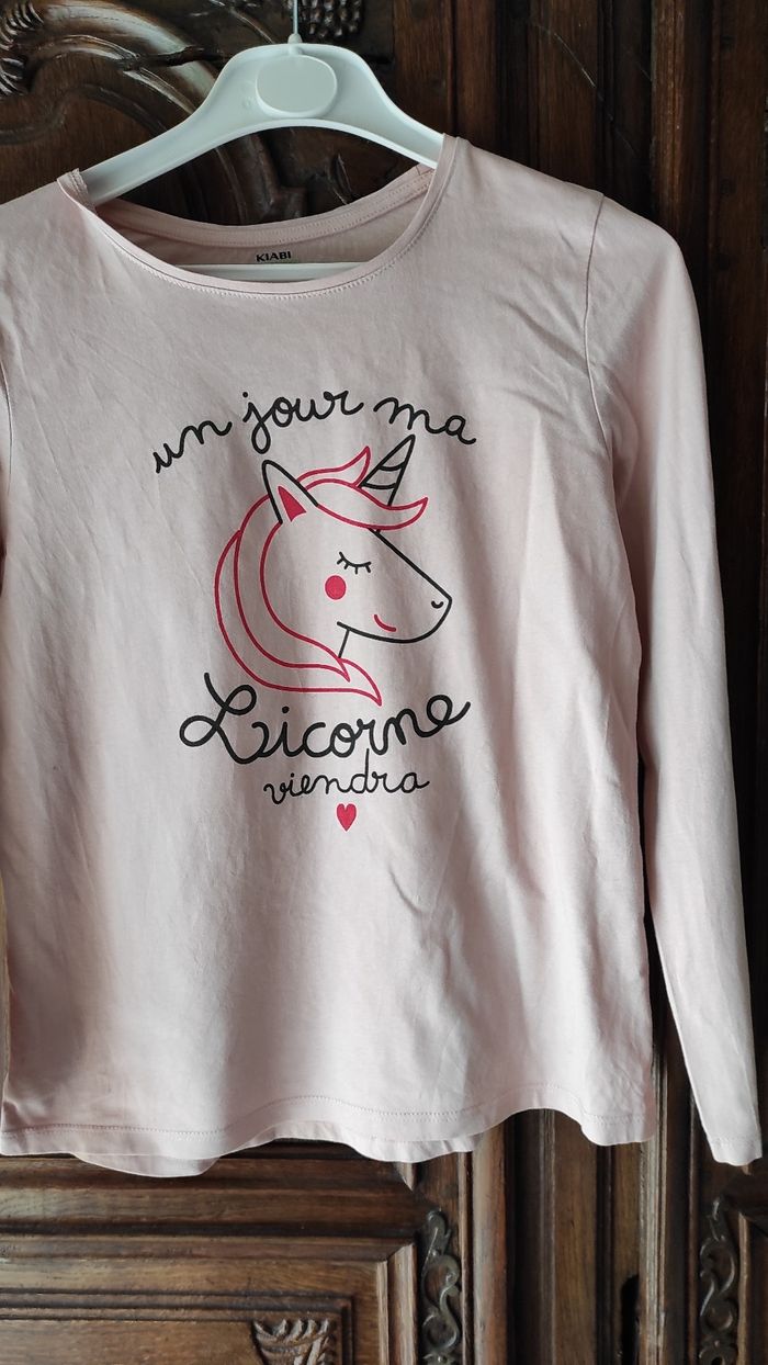 Beau tee-shirt manches longues rose pâle avec motif licorne. En très bon état . Coton biologique
