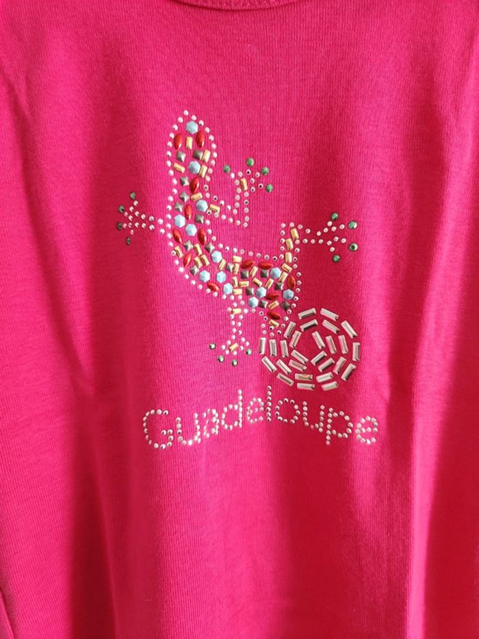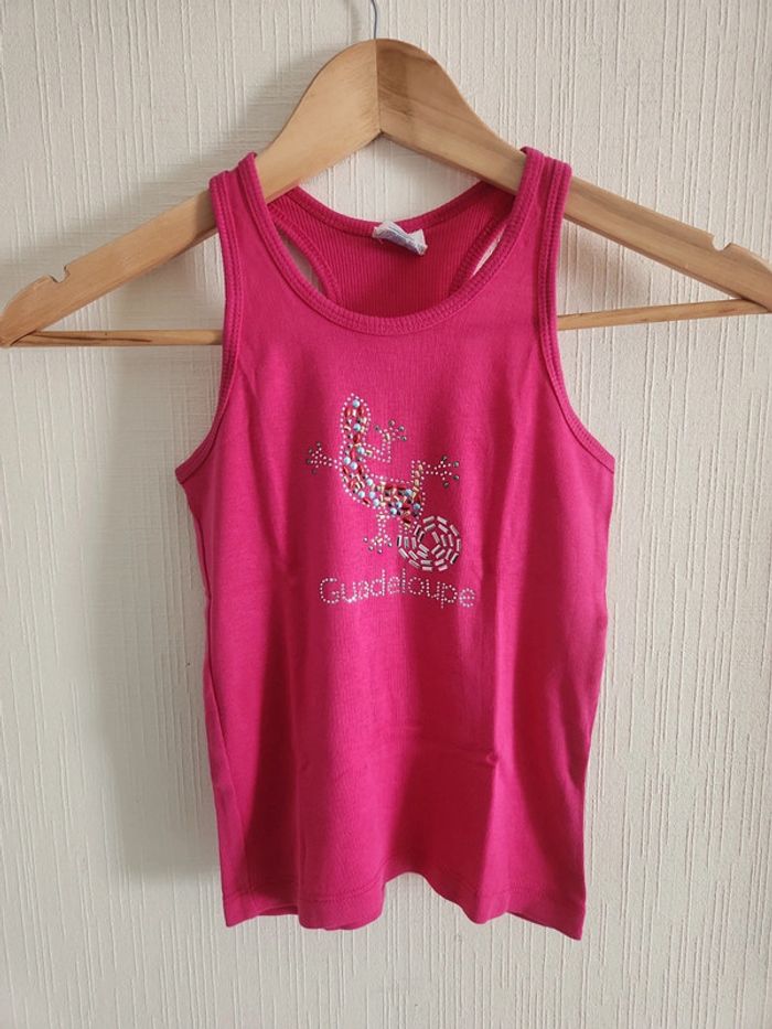 Haut rose sans manches avec dos nageur motif Guadeloupe et salamandre en taille 7-8 ans, comme neuf Envoi rapide et soigné via diverses plateformes #pseudodofille7ans #pseudodofille8ans #Guadeloupe #rosefuschia #rose #dosnageur #teeshirtsansmanches #lezard