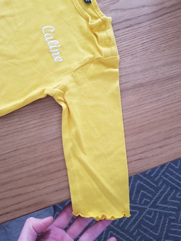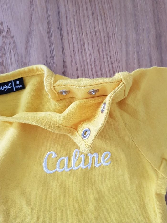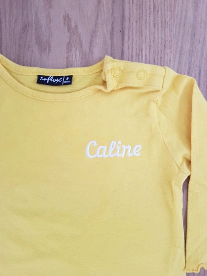 Tee-shirt jaune avec broderie "Caline" Influx en taille 9 mois, en parfait état Envoi rapide et soigné via diverses plateformes #pseudodobébé9mois #teeshirtmancheslongues #jaune #9mois #fille9mois