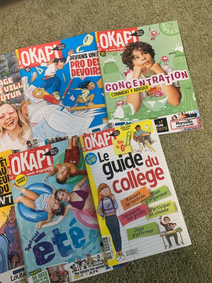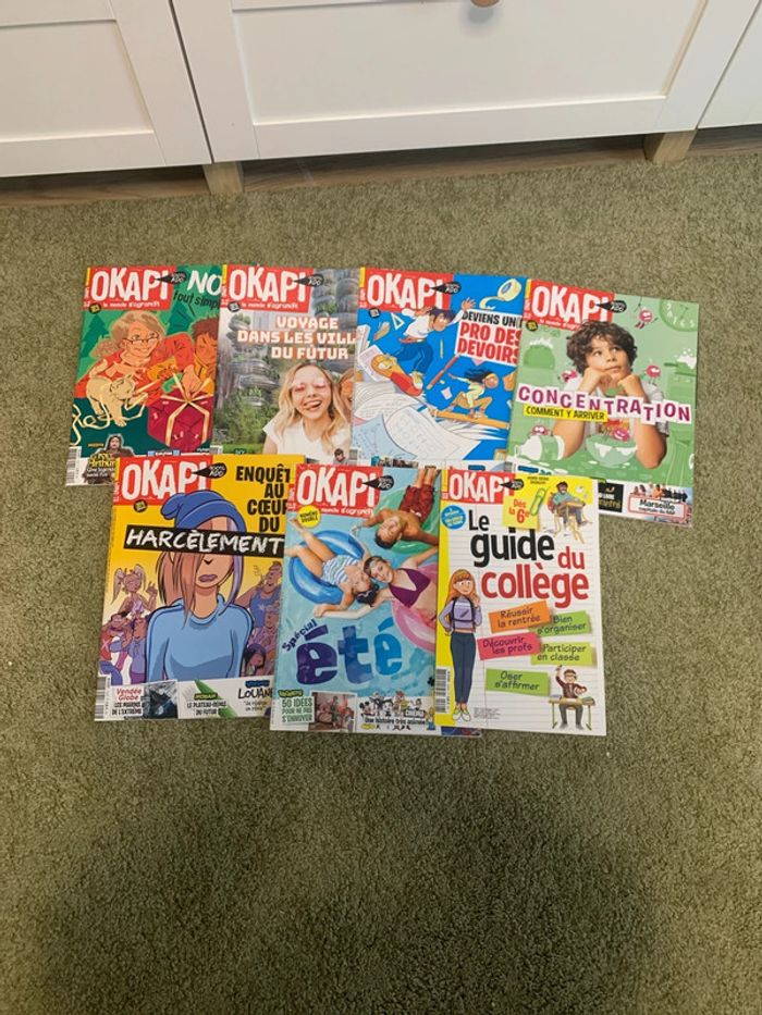 Lot de 7 magazines okapi 100%ado Divers thèmes abordés Harcèlement Les devoirs au collège Sciences Actualités Voyages Cinéma Musique 1 numéro double 1 numéro hors série : guide du collège pour mieux appréhender la future rentrée en tant que collégien avec pleins d’astuces et d’infos. Prix d’un magazine neuf 5,20