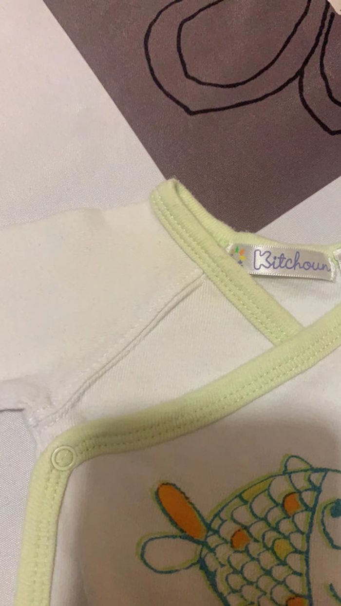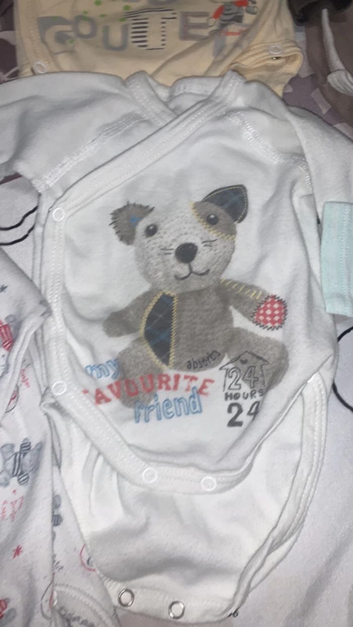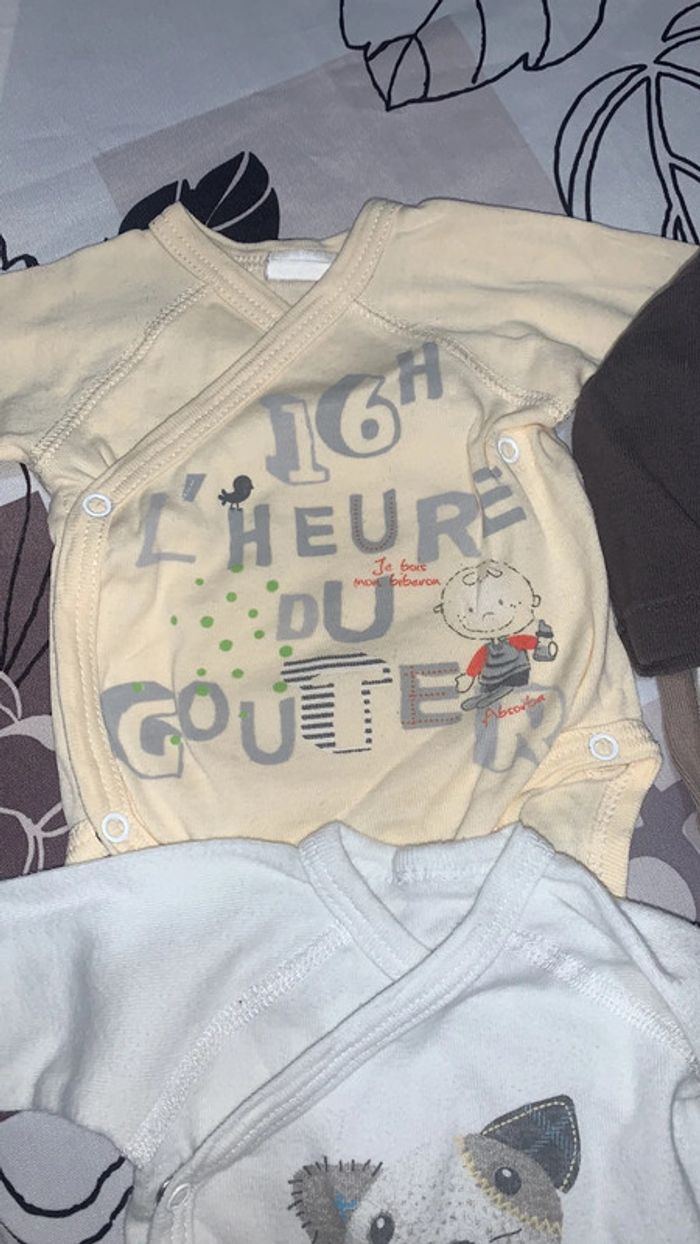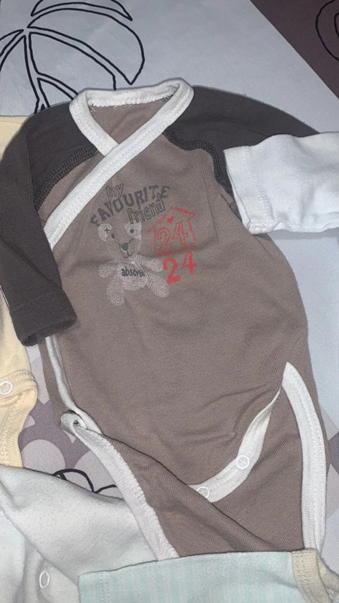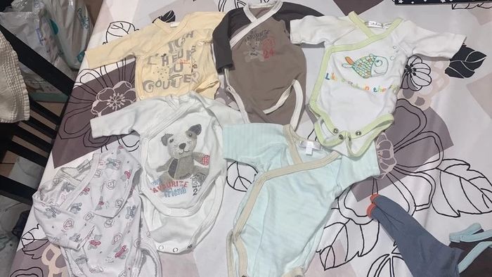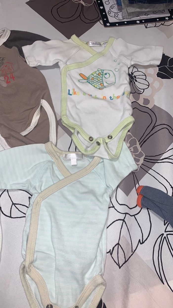 Lot de 6 bodys manches longues Tous en 1 mois. Celui avec le poisson vert est un peu jaunie sur l’épaule (voir photo)