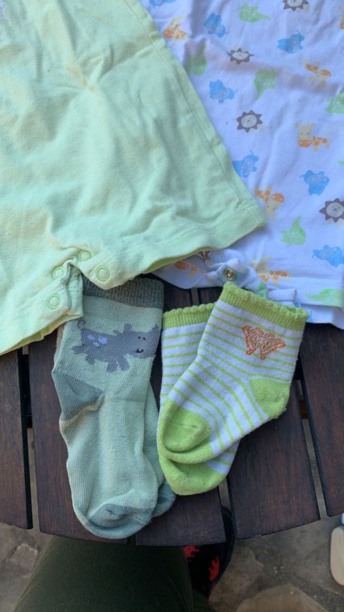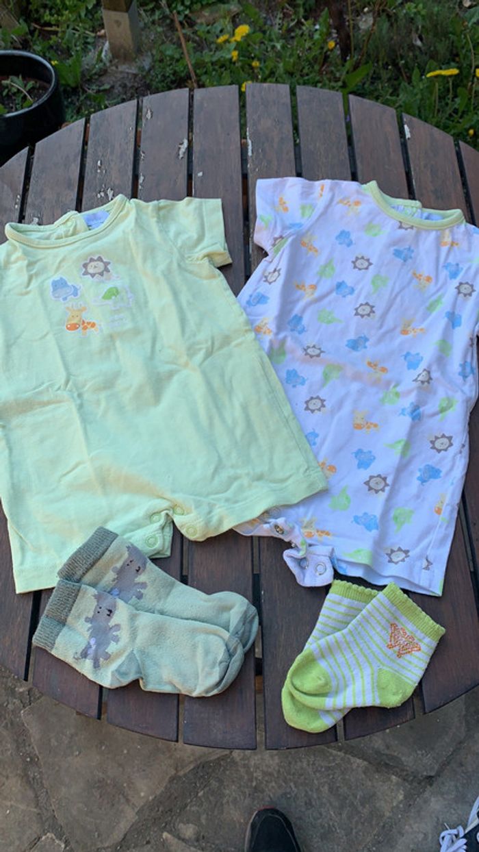 lot de 2 barboteuse assorties idéales pour l’été. avec 2 paires de chaussettes assorties. ⚠️taille 6 mois