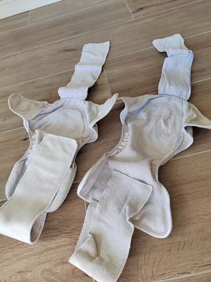 Lot de 2 couches lavables de la marque Imse Vimse Te1 sont 1 avec effet au sec. Pul, élastique OK. Décrassage effectué. Entretenues en 2 cycles comme recommandé avec lessive maison à la cendre Couches achetées d'occasion, peu portées de mon côté. Intérieur et Inserts intégrés un peu rêches. Taille S- 4 à 8kg