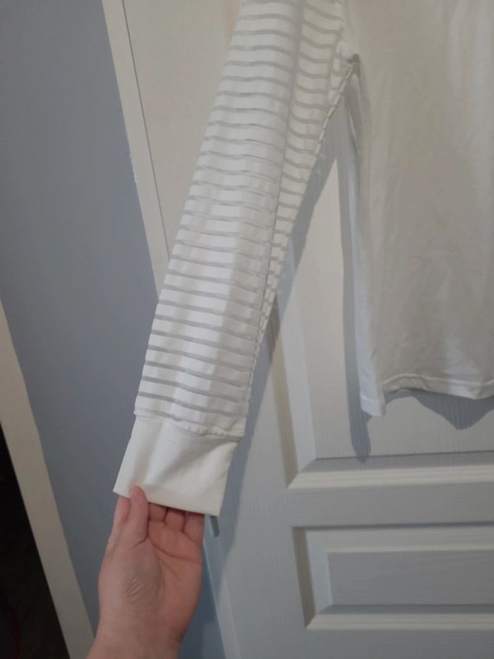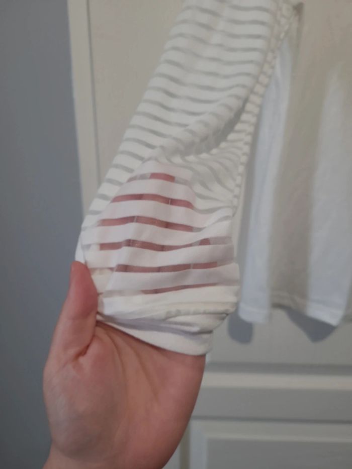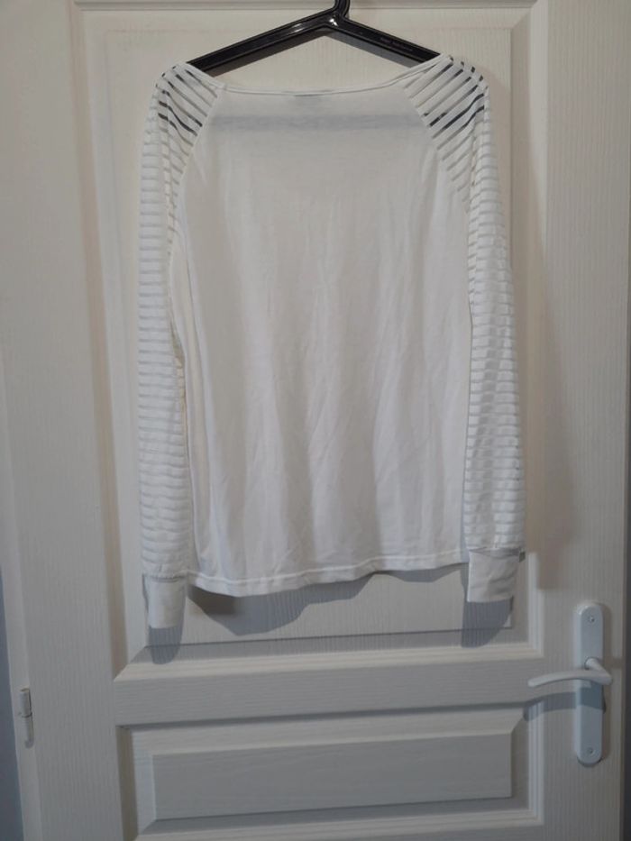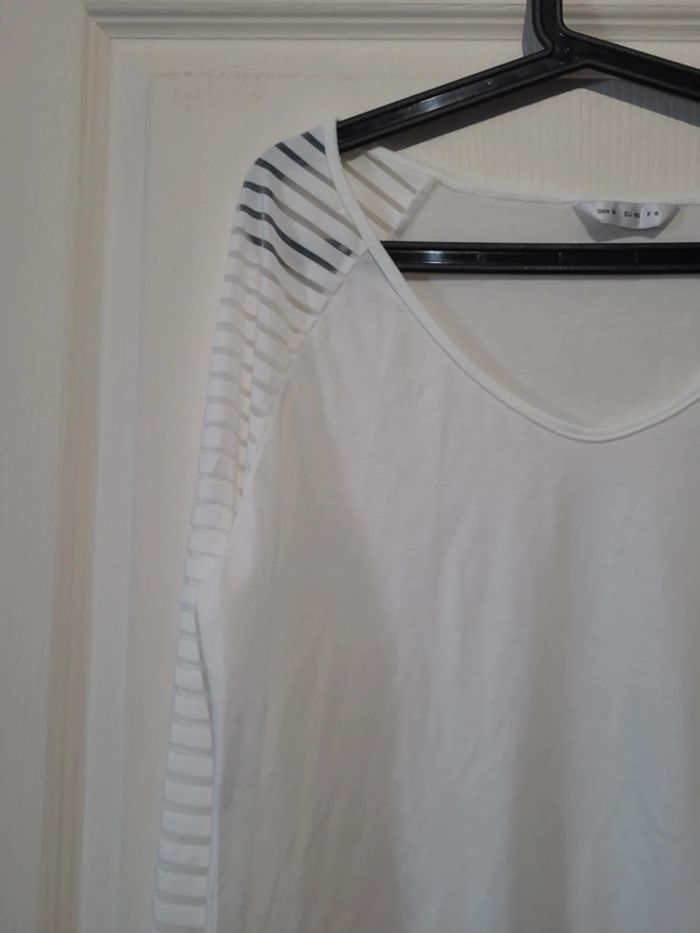 Neuf, joli haut blanc matière douce et élastique avec manches à rayures ajourées Taille 42