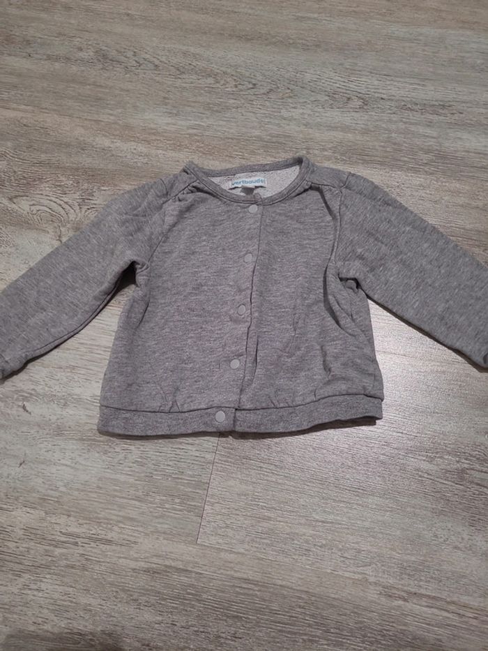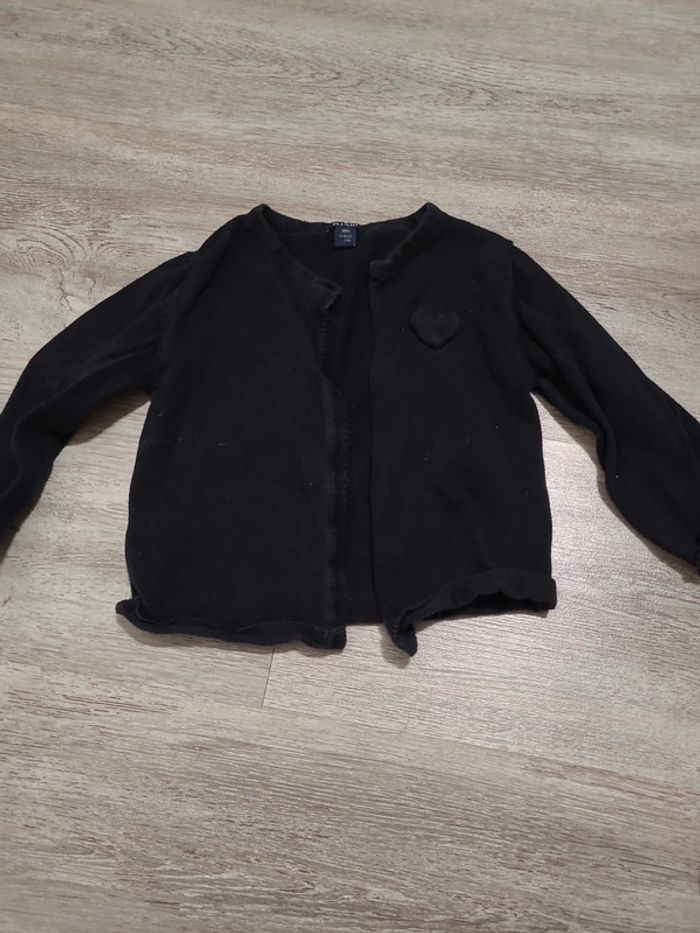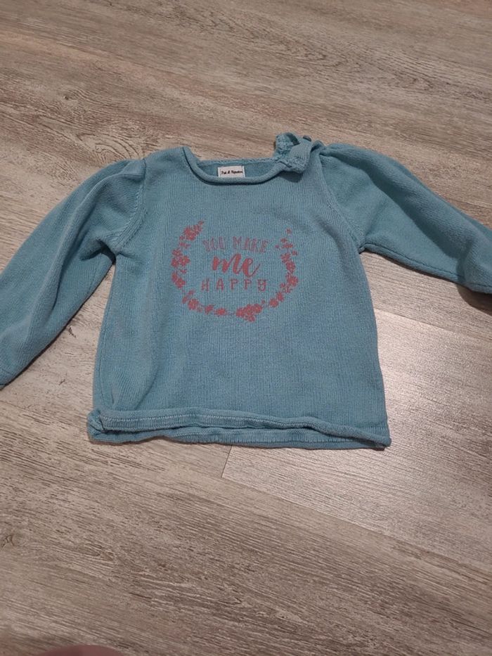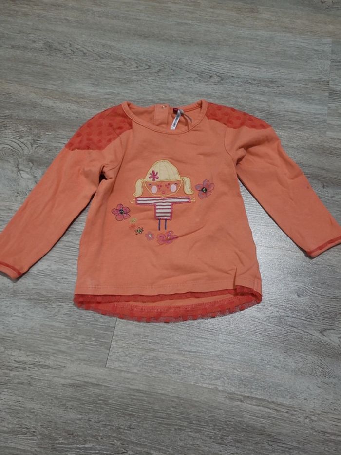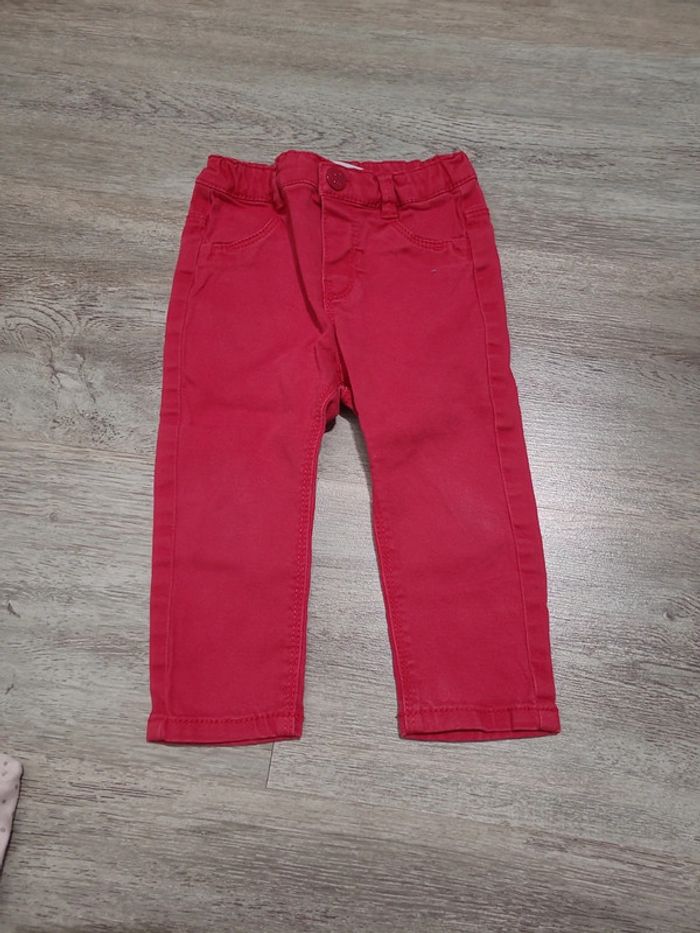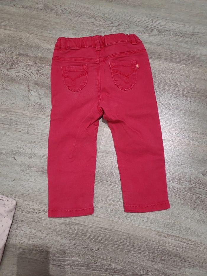 Lot comprenant : Pantalon rouge taille élastique Obaibi Tee shirt orange Orchestra Body rose à pois argents Kitchoun Gilet noir Kiabi Gilet gris à pressions Vertbaudet Pull bleu Pat et Ripaton Taille 18 mois