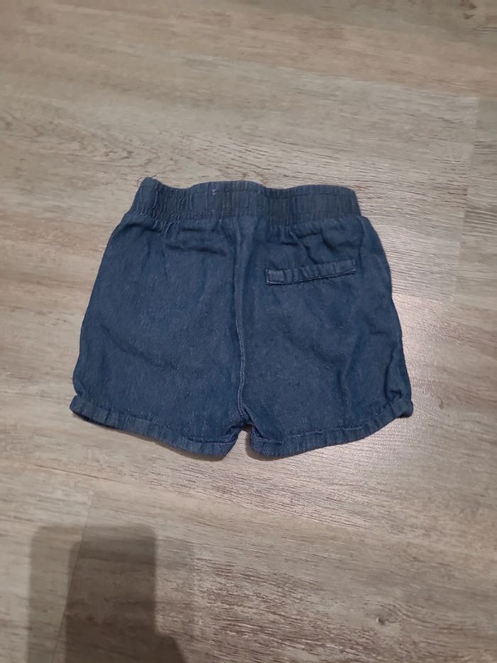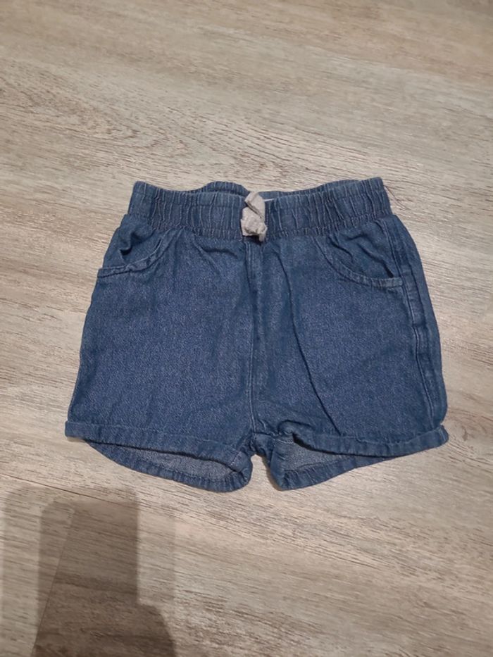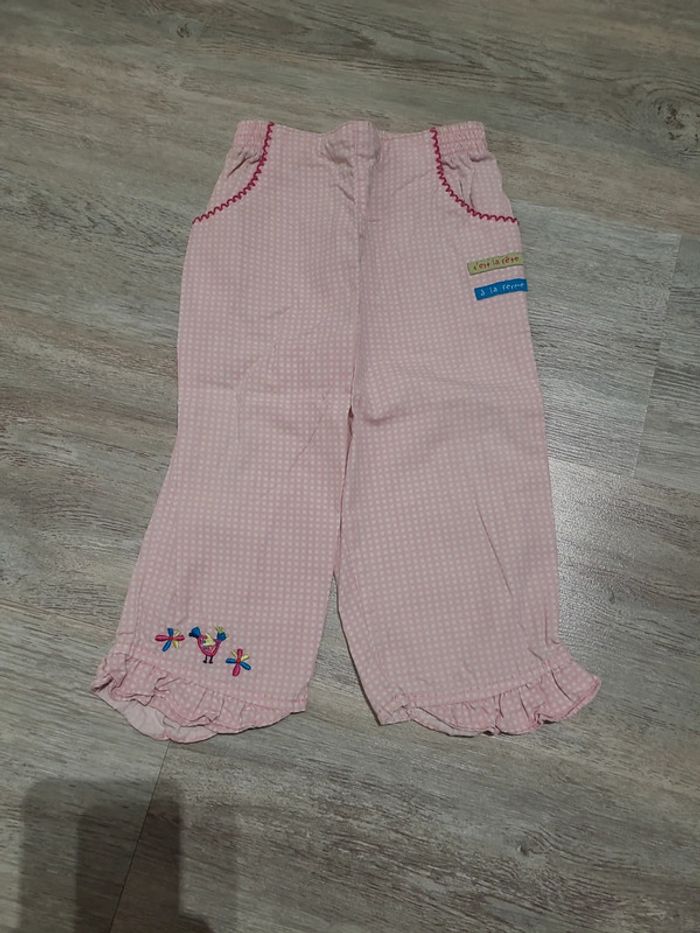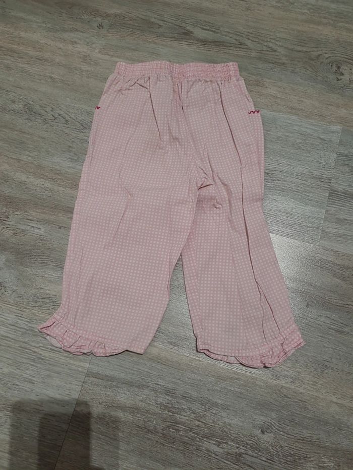 Short en jean taille élastique Mes Petits Cailloux et 1 pantalon en vichy rose In Extenso. Taille 18 mois