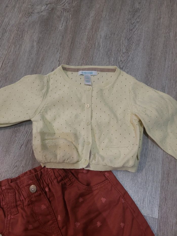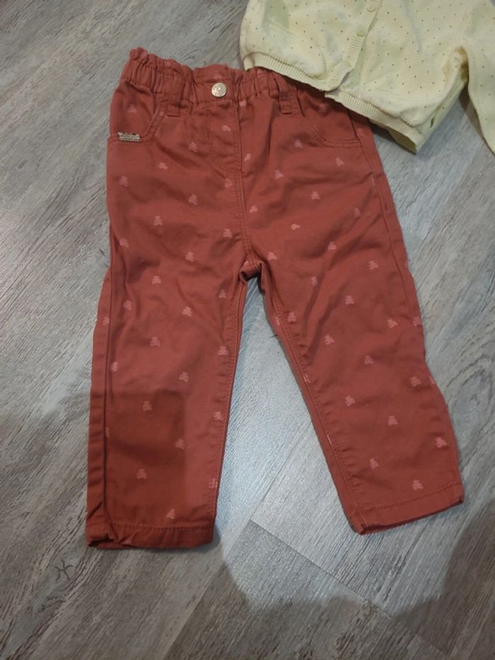 Gilet jaune pâle ajouré Obaibi et pantalon terra cota motifs nounours Lulu Castagnette avec taille élastique et réglable Taille 12 mois