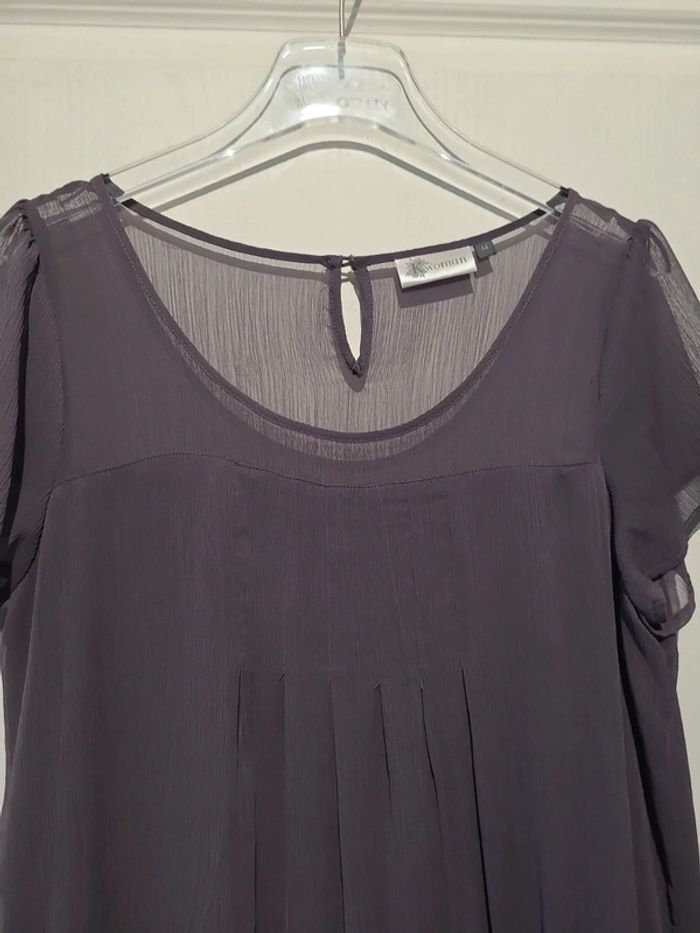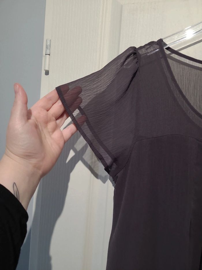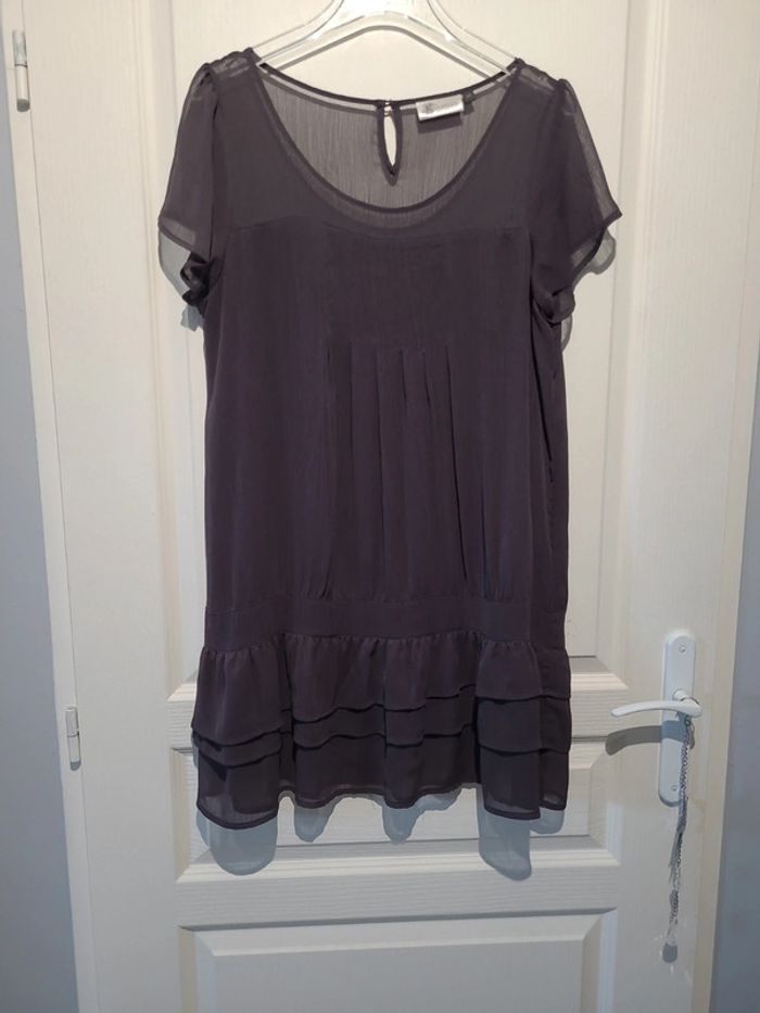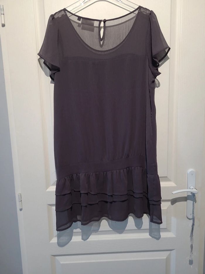 Neuf, robe grise en voile avec volants dans le bas. Taille 44