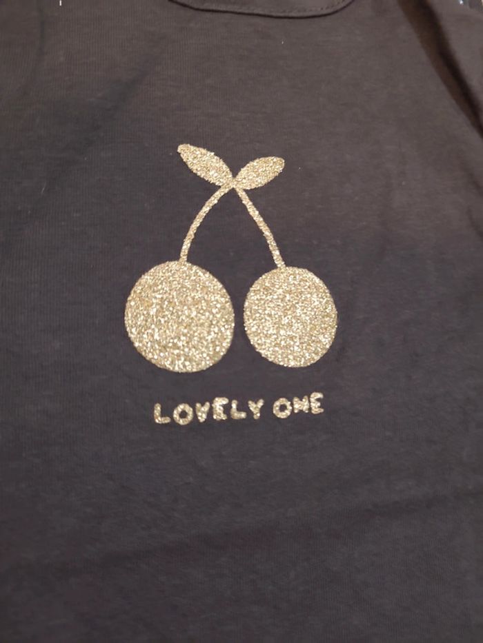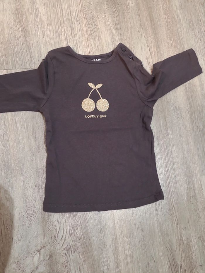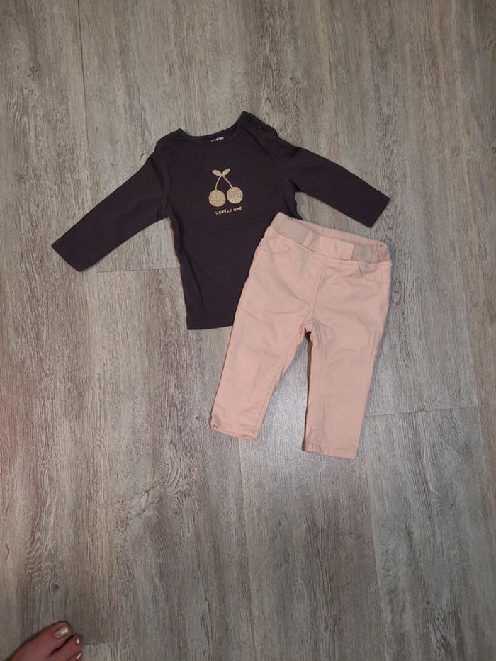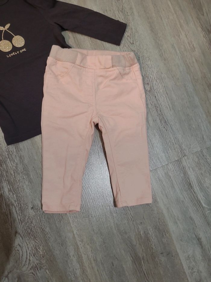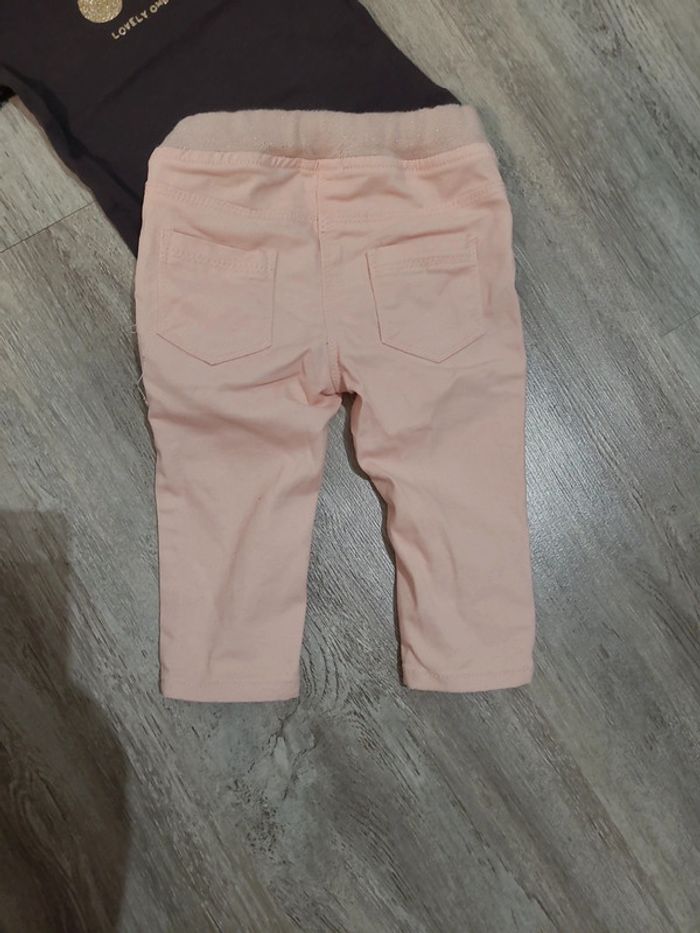Neuf ensemble comprenant un jean rose GEMO avec taille élastique et réglable et un tee shirt manches longues KIABI gris anthracite avec motif doré à paillettes Taille 9 mois
