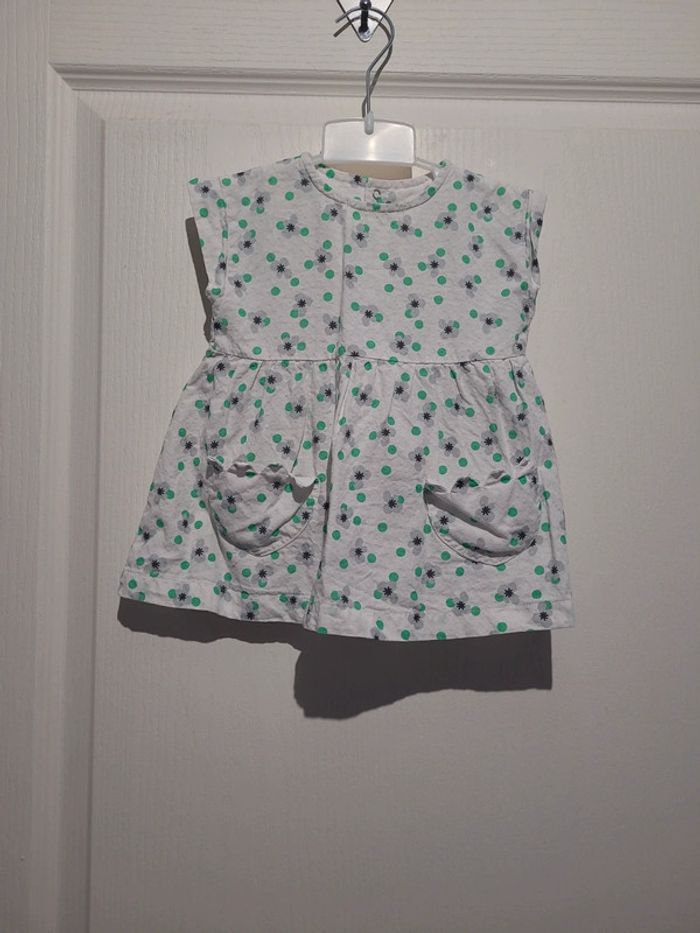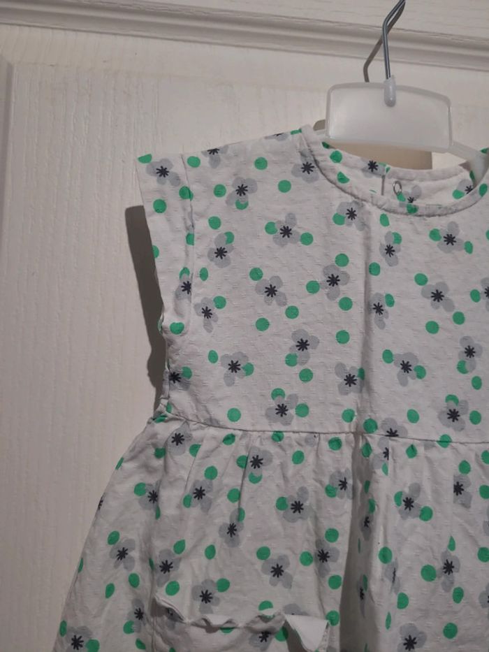 Neuf, robe légère blanche avec fleurs grises et pois verts CATIMINI, pressions dans le dos sur toute la hauteur. Taille 6 mois, 68 cm