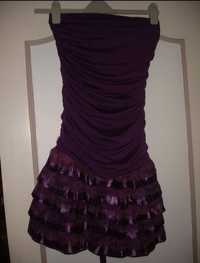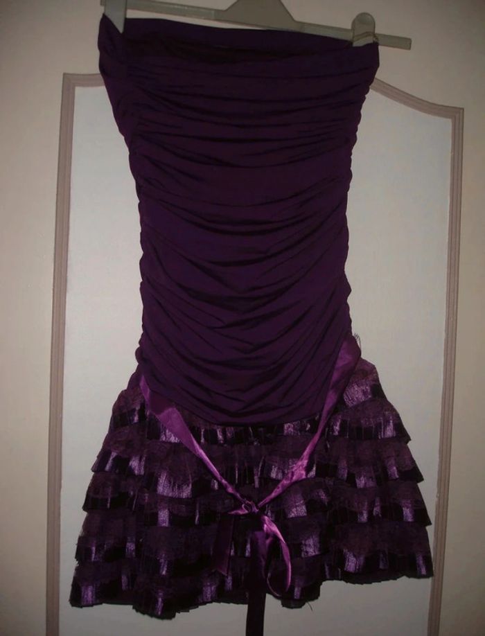 Jolie robe courte neuve matière infroissable 95% polyester 5% spandex largeur du bustier 36cm minimum 41cm max pas de bretelle tiens avec un élastique hauteur totale 72cm couleur violette