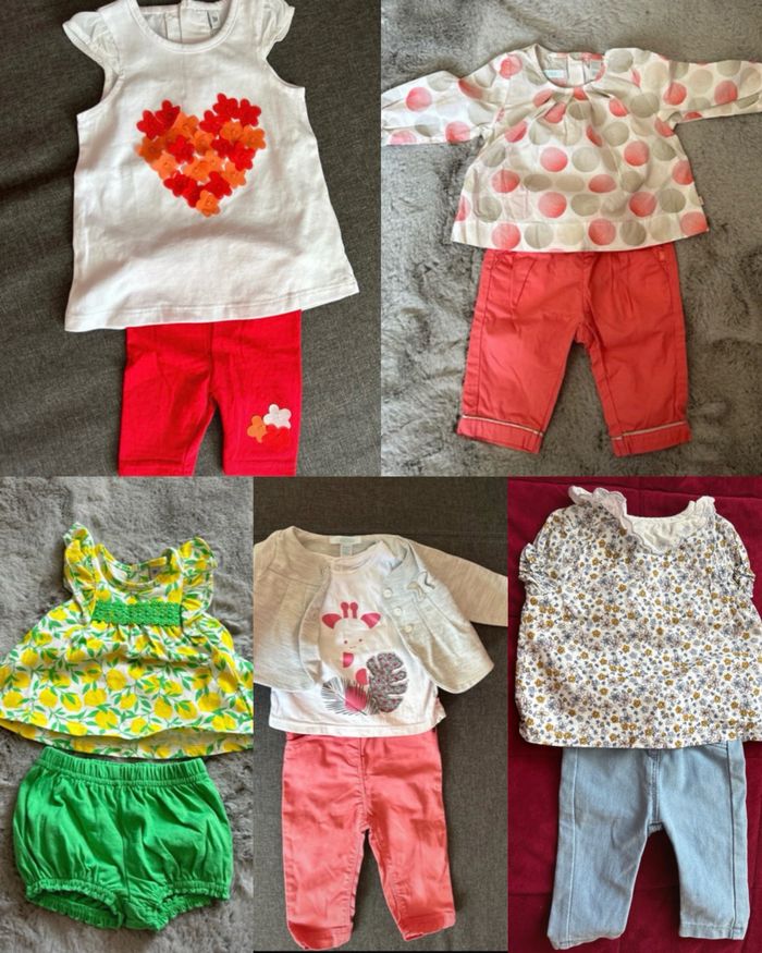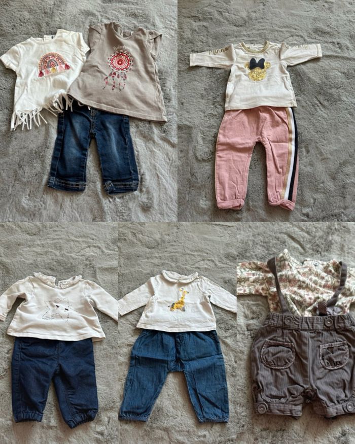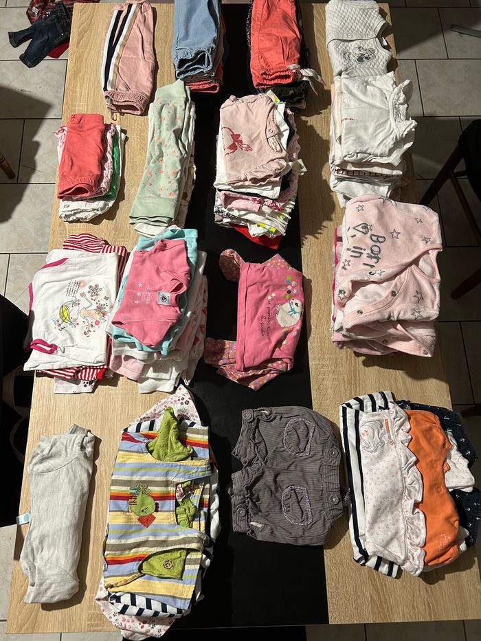 1 gilet fin 3 robes 1 salopette short 5 barboteuse 13 body manche courte 1 pyjama léger 2 pièces 6 pyjamas velours 14 teeshirt manche longue 14 tee shirt manche courte 6 leggings 4 short 1 joggings 6 jeans 5 pantalons 1 gilet épais Différente marque comme kiabi, orchestra et Disney baby