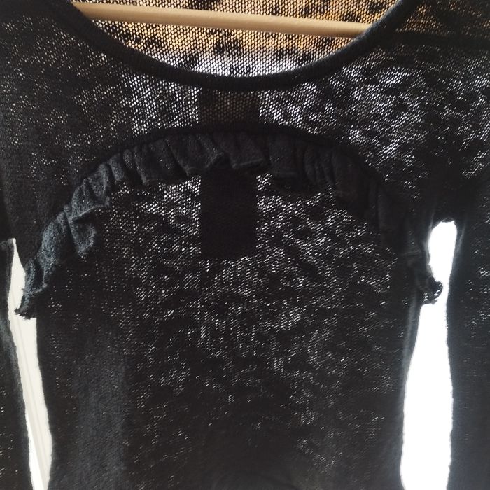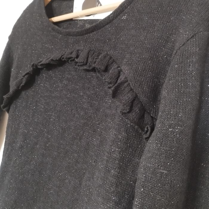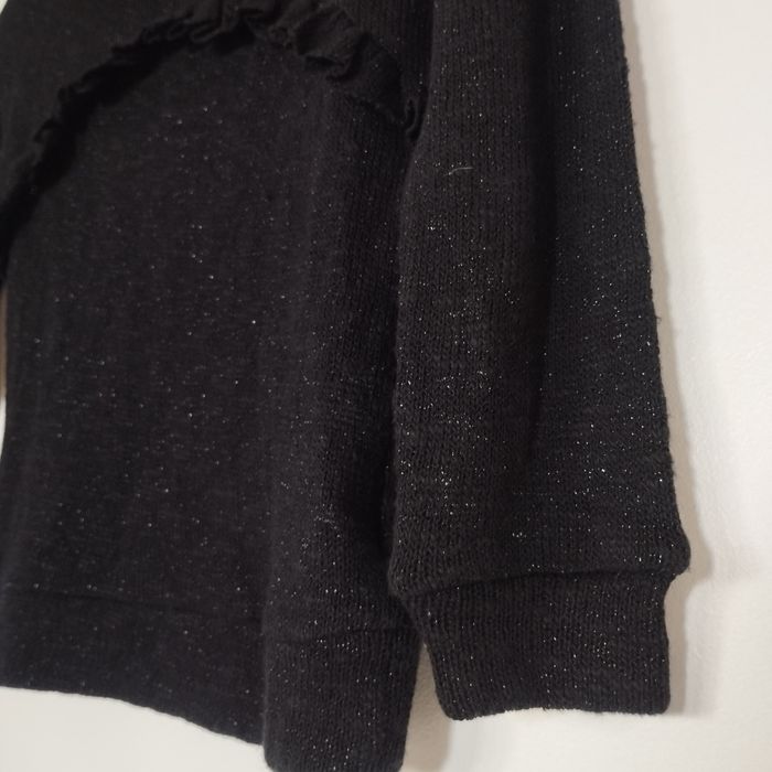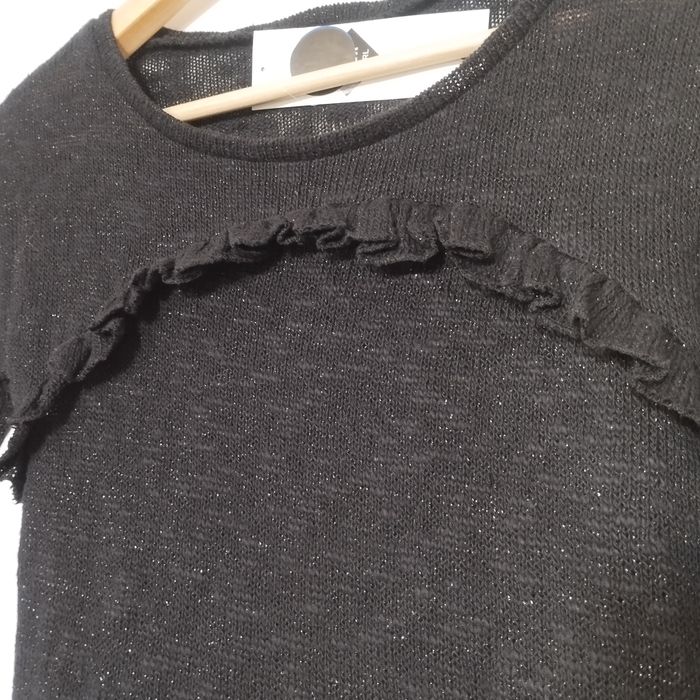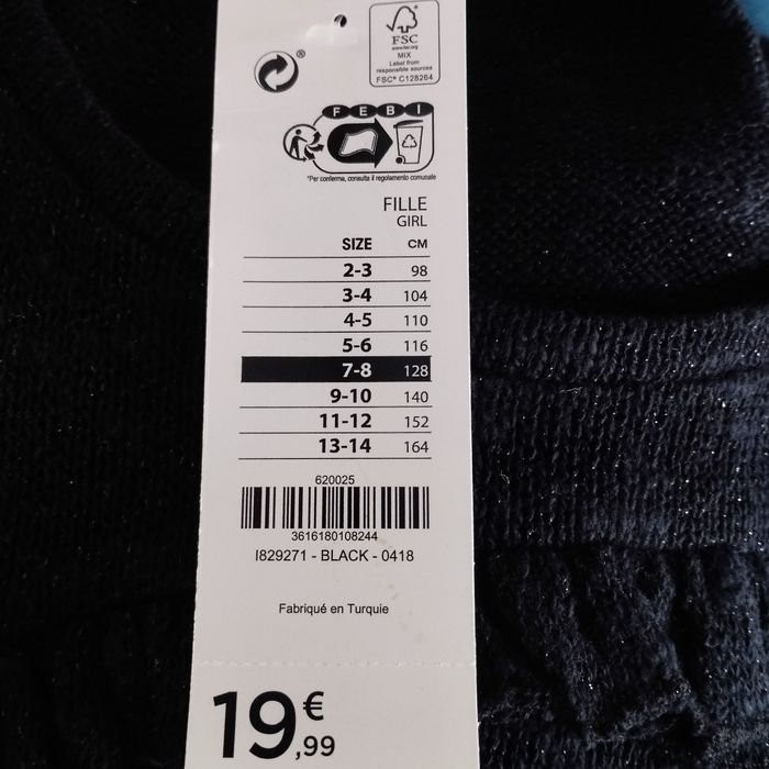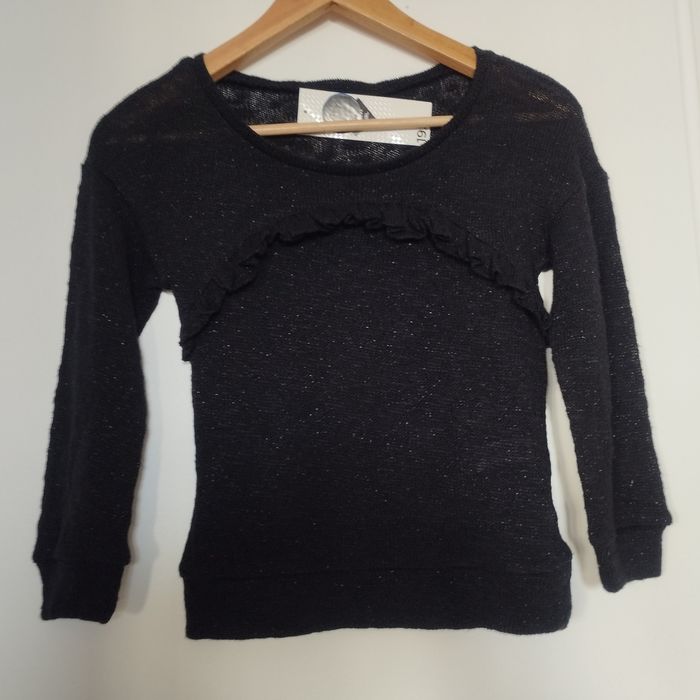 Pull Neuf pour enfant fille de 7/8 ans. Noir pailleté, un peu dans la transparence. Matière chaude. 79%Coton 15%Polyester 6%Viscose 4%Fibre métallique. Son prix d'achat 20€.
