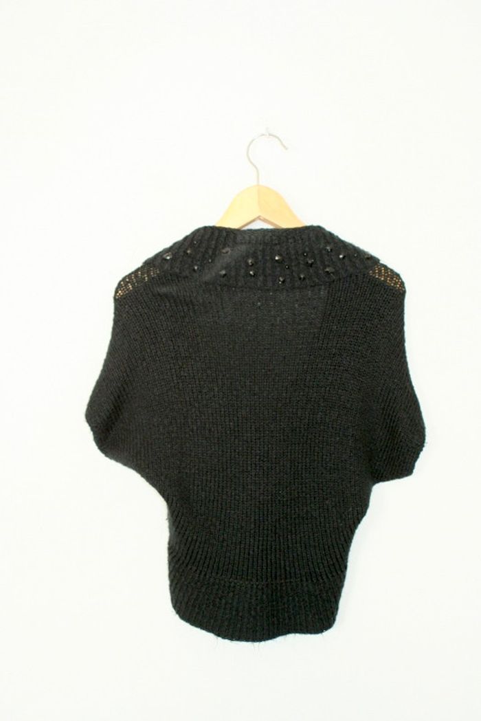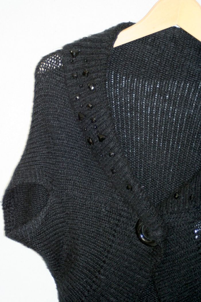 Gilet noir court, manches courtes, sans étiquette de taille mais correspond environ à un 42/44, un peu bouloché et quelques pierres qui se détachent, 100% acrylique, 210g