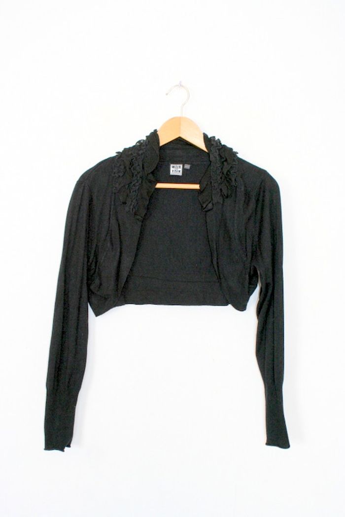 Boléro noir Walk and Talk de chez Kiabi, taille 42/44, 80% viscose / 20% polyamide, 40cm d'épaule à épaule, 47cm d'aisselle à aisselle, 31cm de long, 240g