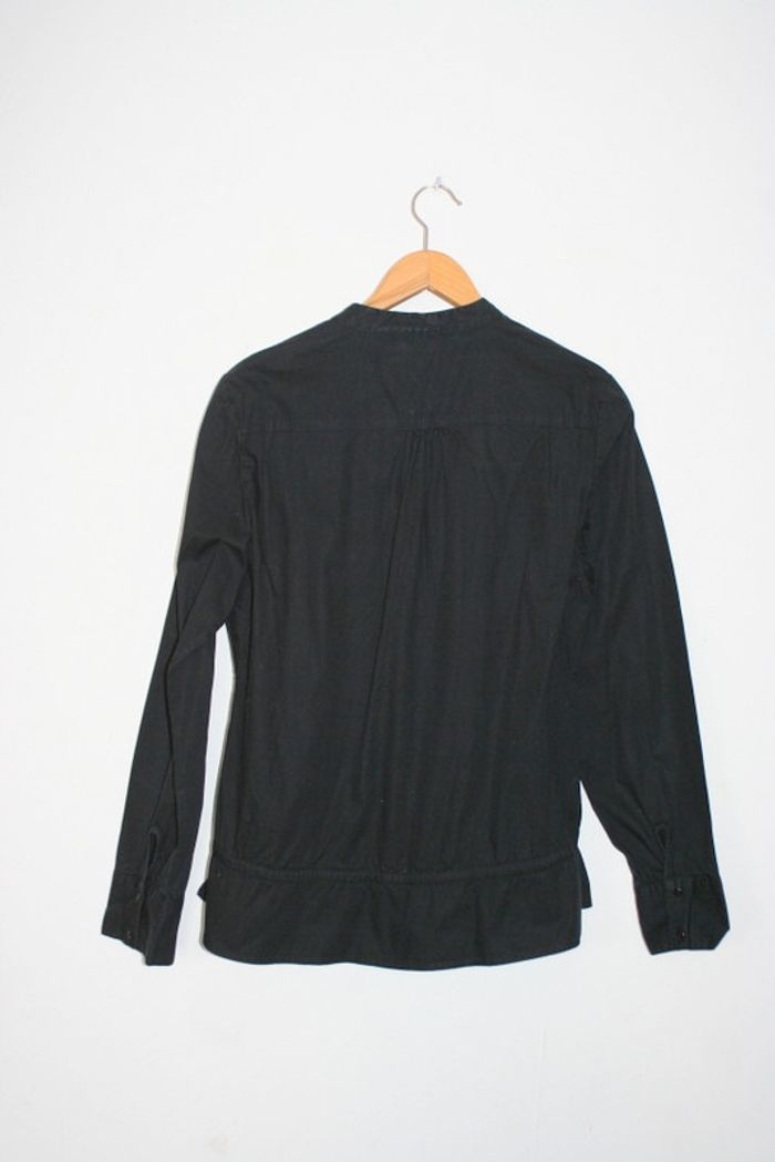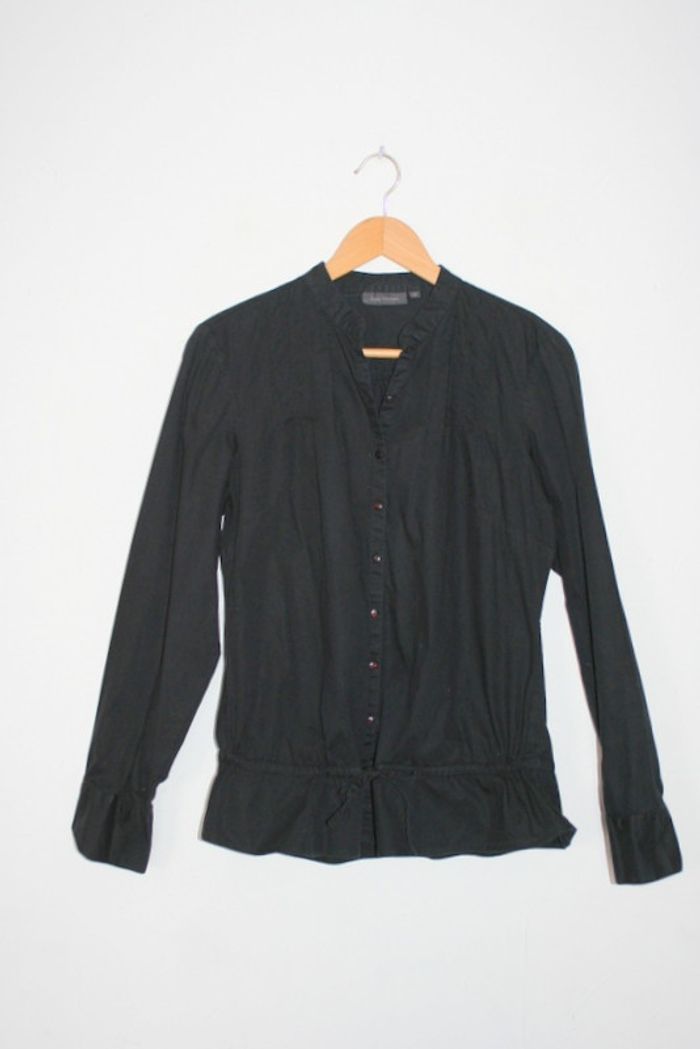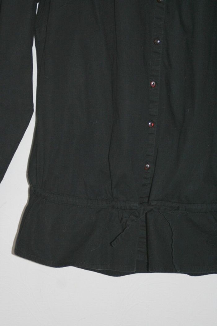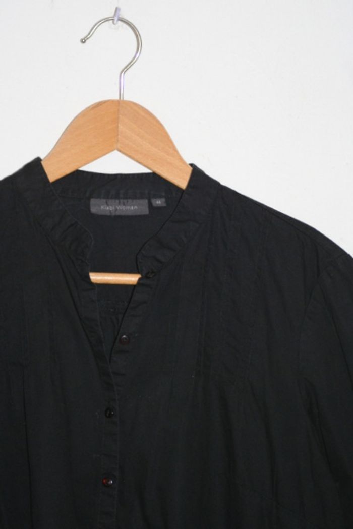 Chemise noire Kiabi taille 46, possibilité de resserrer au niveau de la taille cf photo, 100% coton, manque le dernier bouton tout en bas mais 2 boutons de rechange à l'intérieur, 62cm de long / 41cm d'épaule à épaule / 53.5cm d'aisselle à aisselle, 200g