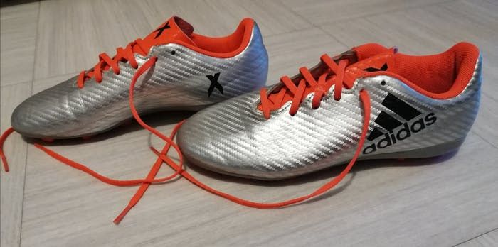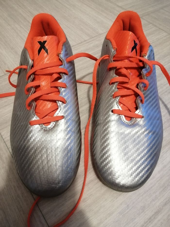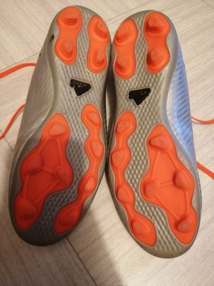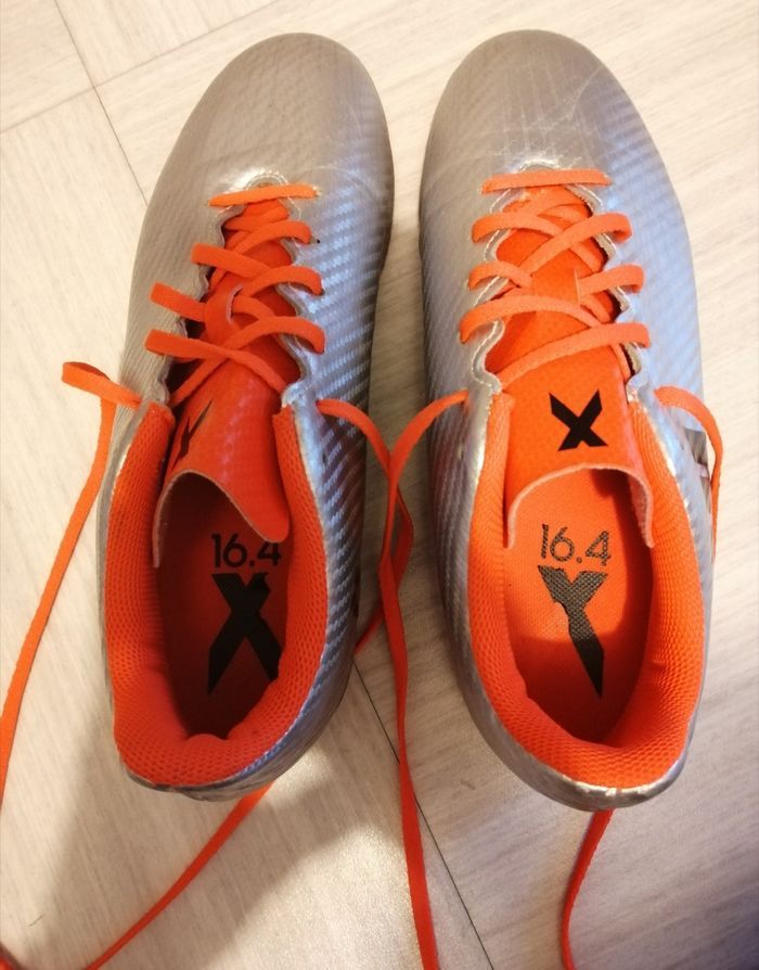 Basket de foot à crampons de marque Adidas, modèle 16.4 X Pointure 38-2/3 En très bon état car très très peu mises. Couleur gris argenté/orange