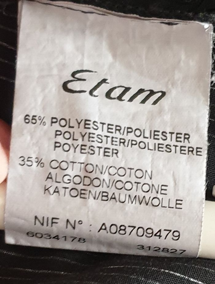 Chemisier noir à rayures blanches, en bon état. Le col est pointu et le bas du chemisier est arrondi. 8 boutons. Le bas des manches peut se porter de deux façons, droite, ou le poignet à revers. Etam Taille 36 65 % polyester – 35 % coton Les mesures, prises à plat, sont données à titre indicatif et peuvent varier de quelques millimètres. - Largeur d’épaules : 37 cm - Largeur emmanchures : 44 cm - Longueur : 58 cm - Longueur de manches : Dessus 62 cm – dessous 50 cm Envoi rapide et soigné.