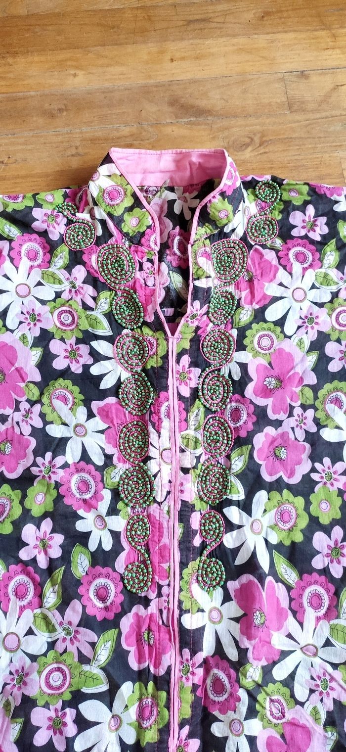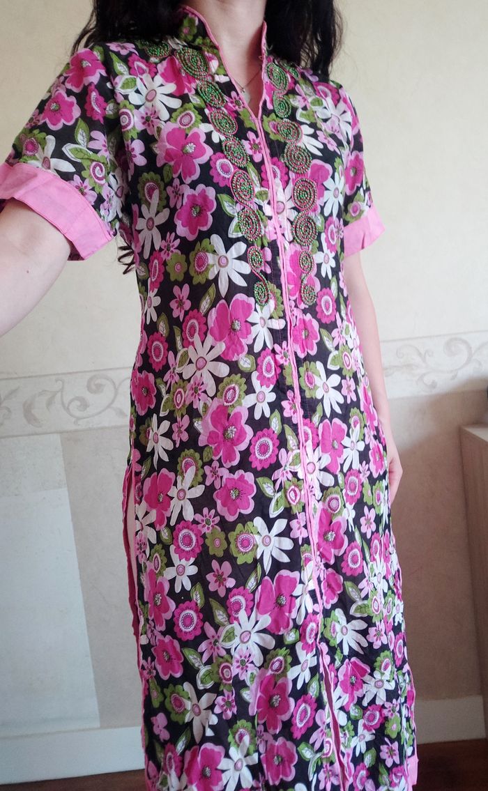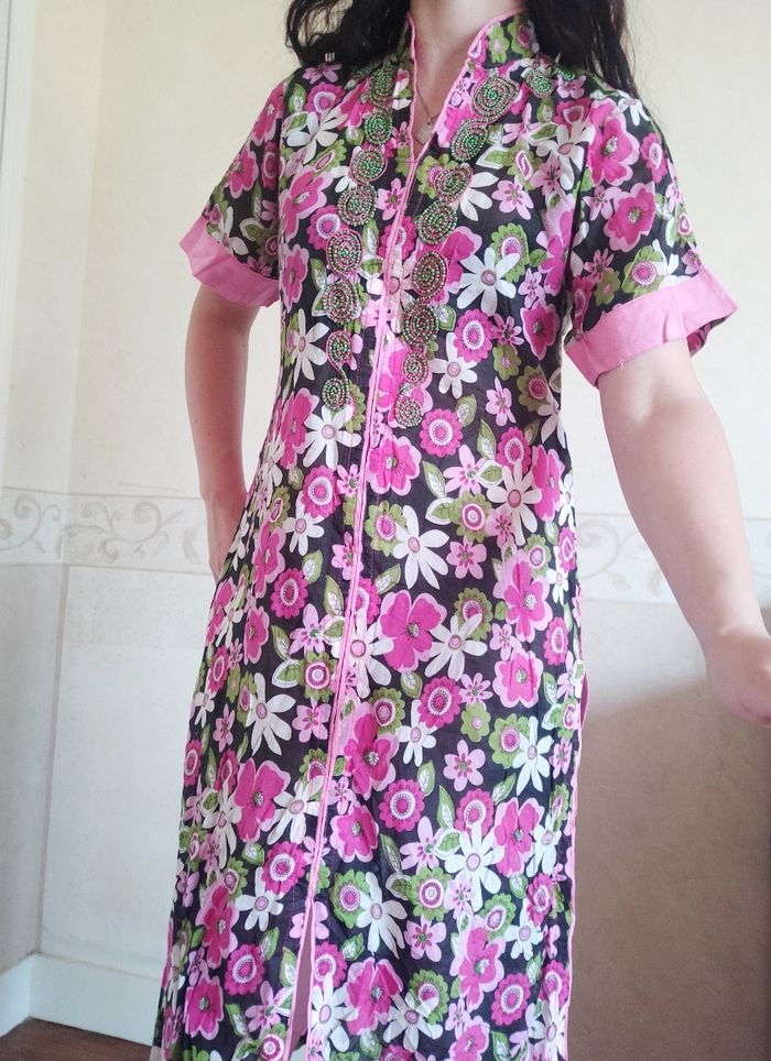 Superbe robe style oriental, avec perle brodée à la poitrine. Fendue très haute sur les côtés. Légère à porter. Longueur 106cm Epaules à épaules 34cm Aisselles à aisselles 46cm