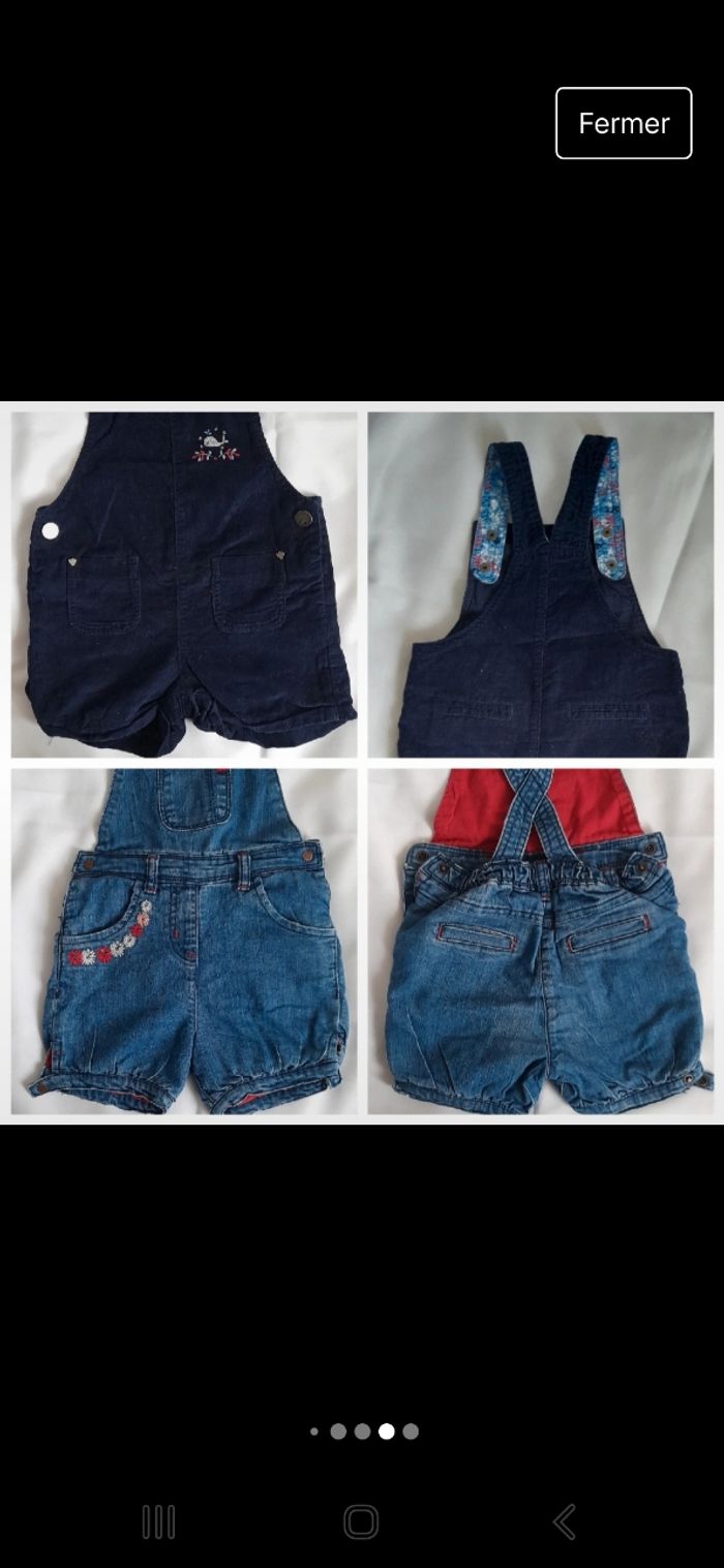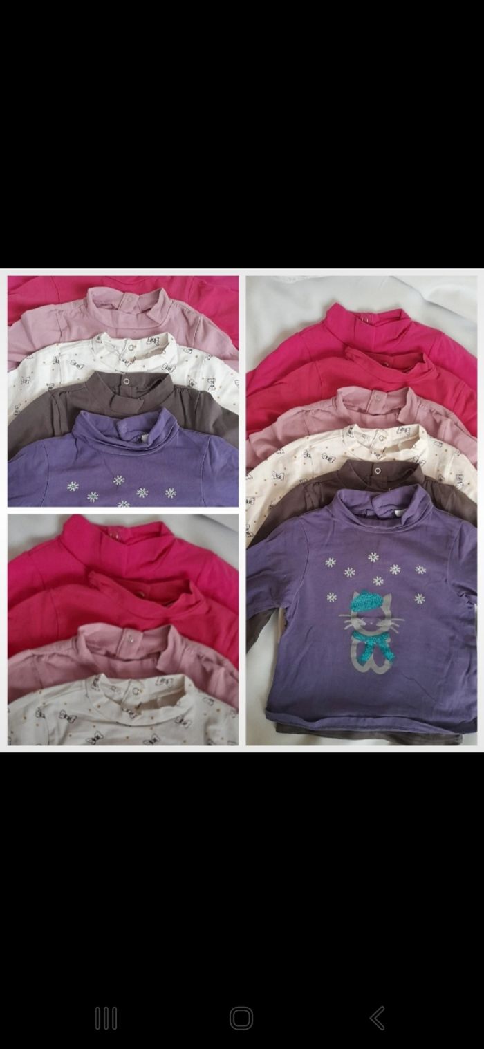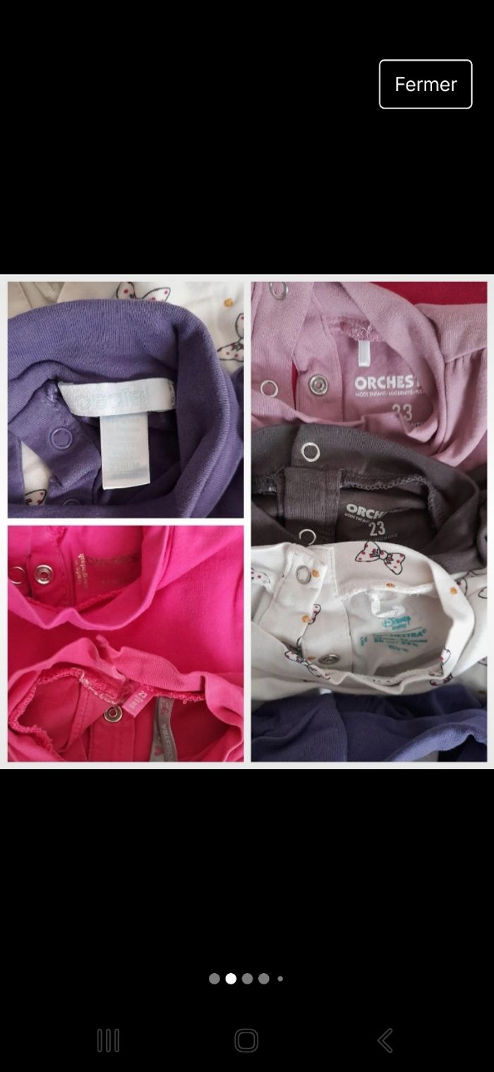 Lot 18 vêtements. 6 tee shirt manche longue. 3 tee shirt col montant. 1 pyjama. 1 pull.1 gilet.1 sweat. 1short.2 pantalons neufs. 2 salopettes courtes. MARQUE Orchestra Obaibi. Bon état.