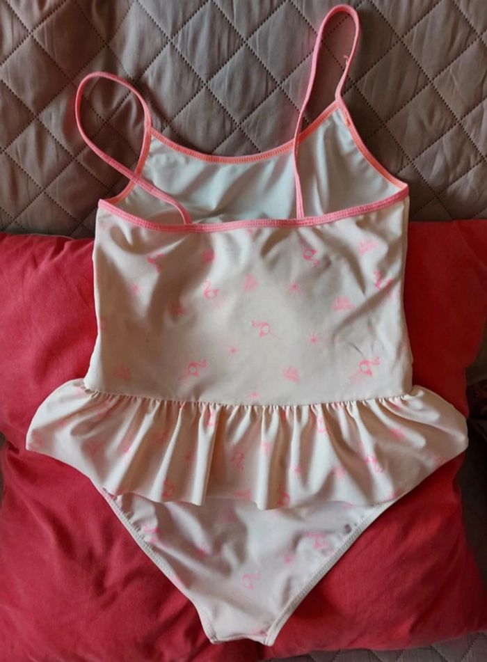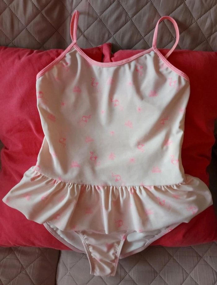 Très mignon maillot de bain 1 pièce Avec volant Couleur Rose orné de flamant rose/ palmier / hello summer Taille 14 ans Marque Vertbaudet Idéal pour la piscine. En très bon état (Peu porté)
