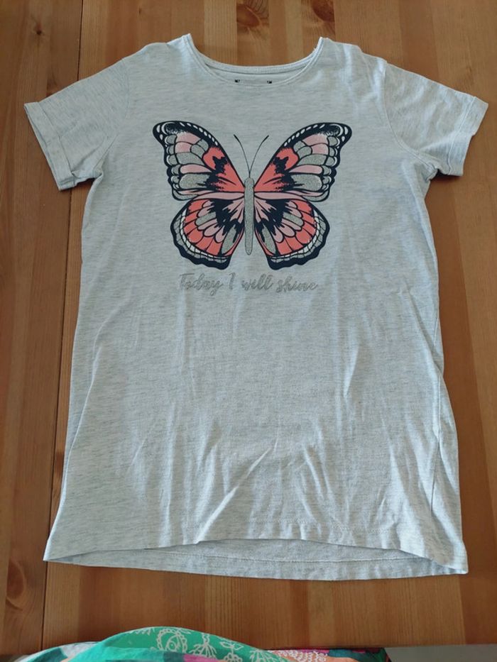 T-shirt fille manches courtes Marque Primark Taille 14 15 ans (166 cm) Couleur gris orné d'un papillon En excellent état