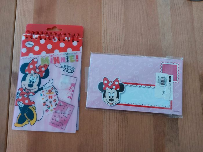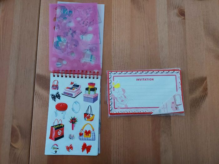 Disney Minnie Mouse Le lot comprend : - 8 cartes d'invitations + 8 enveloppes neuves (2 ont été utilisées) - 1 carnet avec des pochoirs / calques en plastiques + des stickers + de nombreuses feuille à l'effigie de Minnie Neuf.
