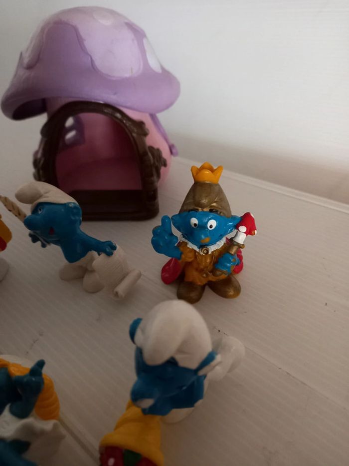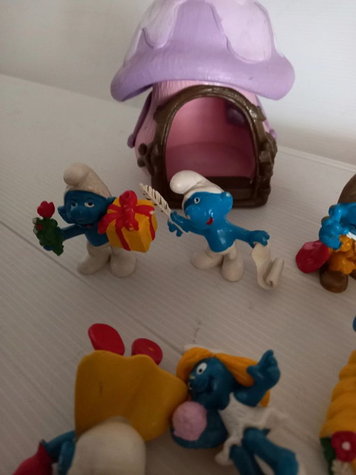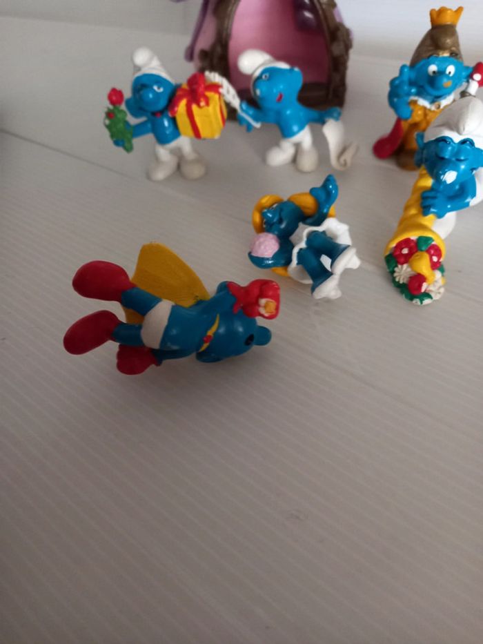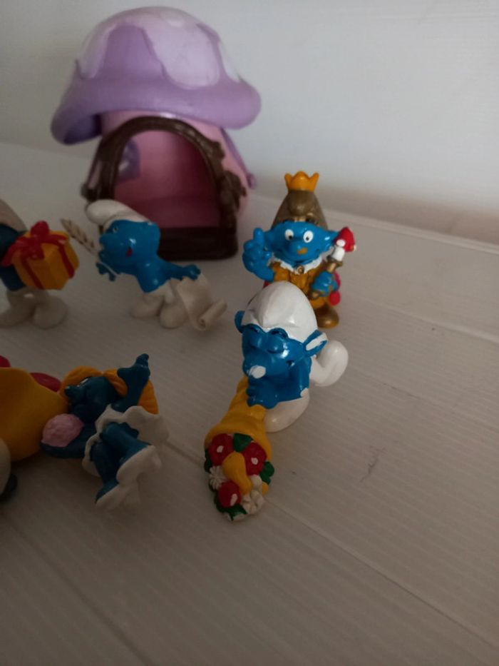 #schtroumpfstephbreizh44 6 personnages en état moyen, traces d'usage et parfois abîmé. La maison est de 78, la porte est manquante. De marque schleich et bully. Livraison dans un carton solide avec rembourrage. Retour possible sous 14jours lot entier