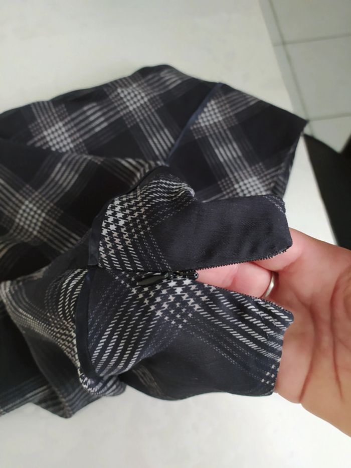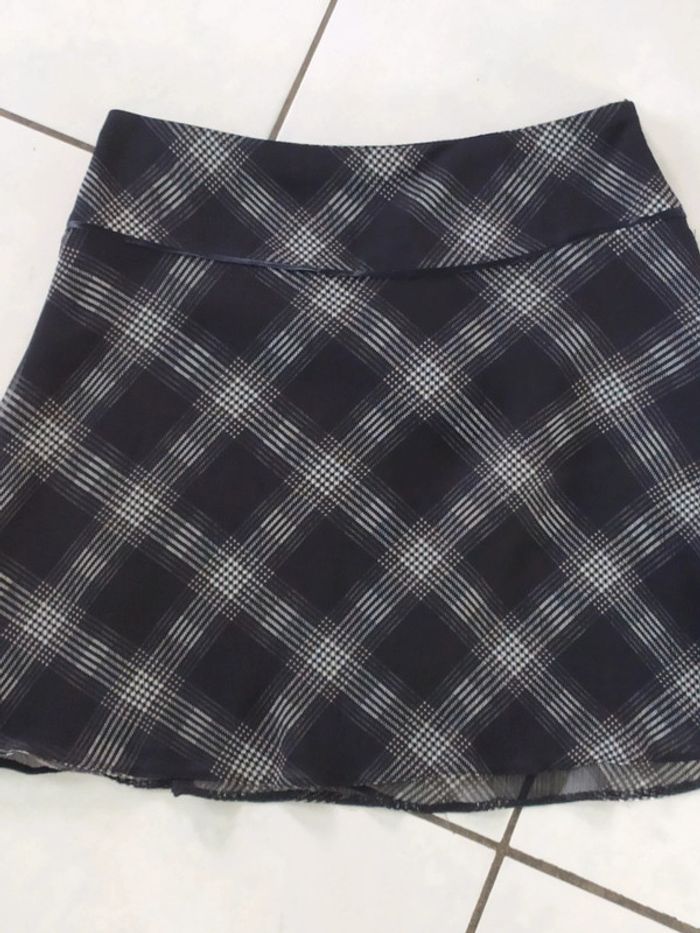 Jupe fluide forme trapèze à carreaux noir et blanc . Entièrement doublée avec un voile sur le dessus. Largeur à la taille : 39 cm, longueur :45 cm