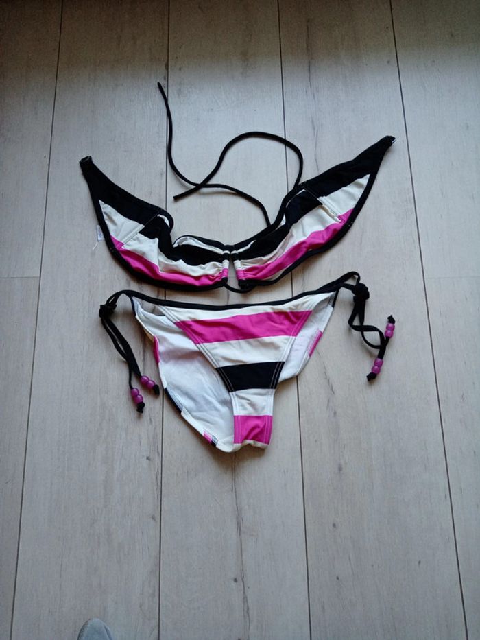 Maillot de bain rayé rose deux pièces Tribord. Haut : taille 95C Bas : taille 44