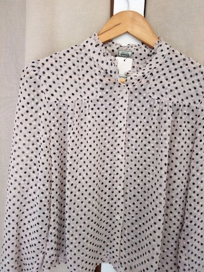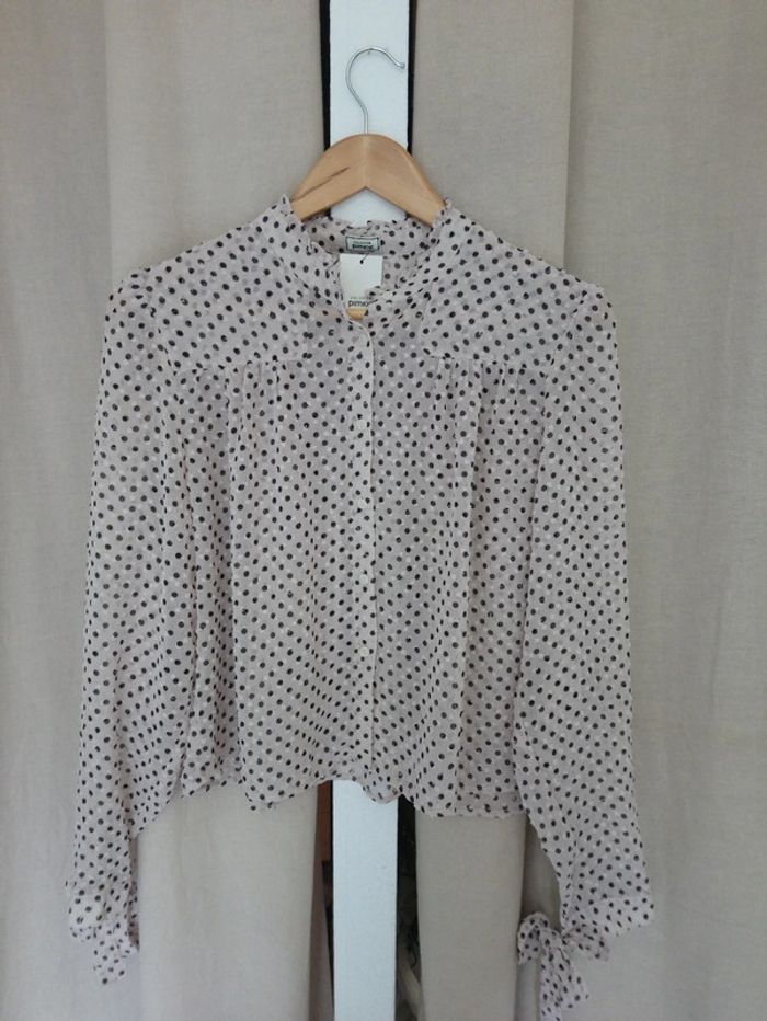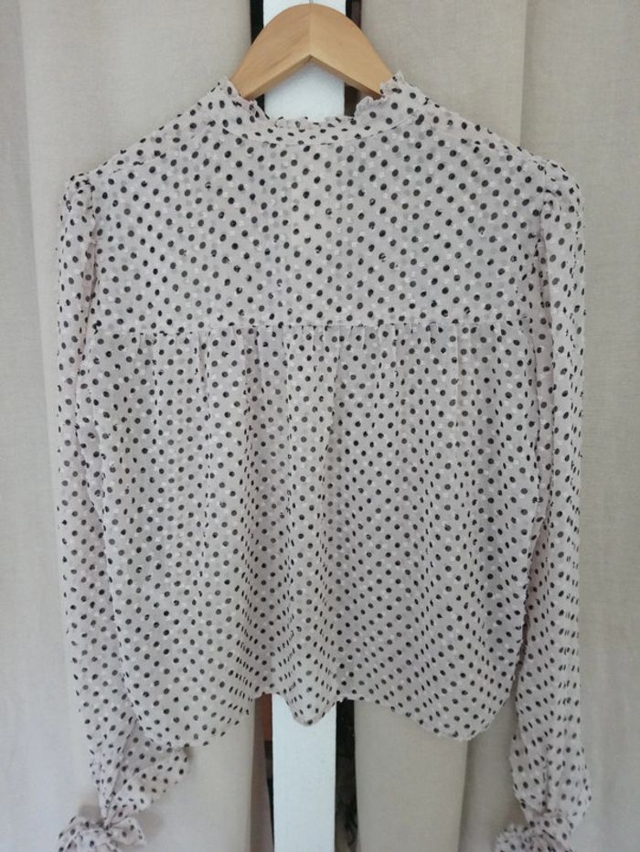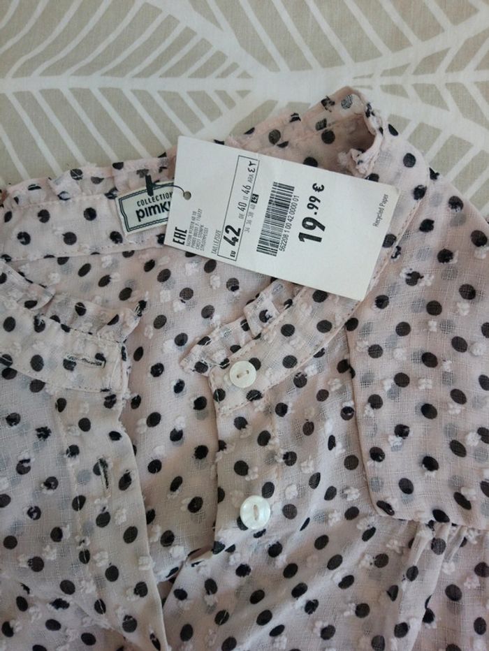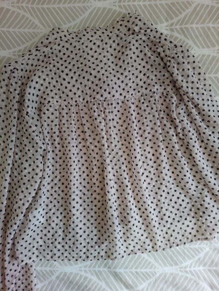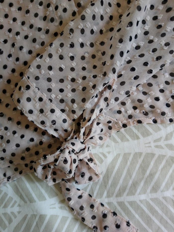 Neuf, avec étiquette d'origine. Blouse élégante avec de jolis finitions, tissu fin assez transparent, mousseline texturée + imprimé pois. 100% polyester. Couleur beige rosé/rose poudré.