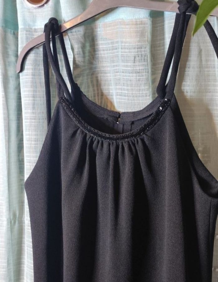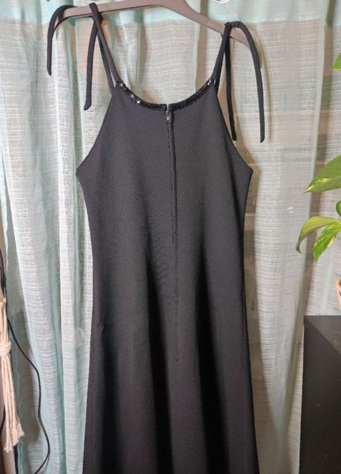 Robe de cocktail année 80 de ma tante, noire et très longue avec bretelles réglables et sequins sur le col. Grande fermeture éclair a l'arrière. 100% polyester, made de france et taille 46