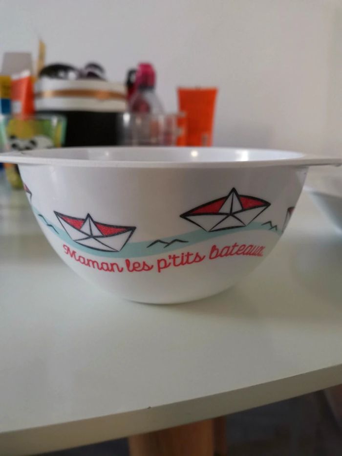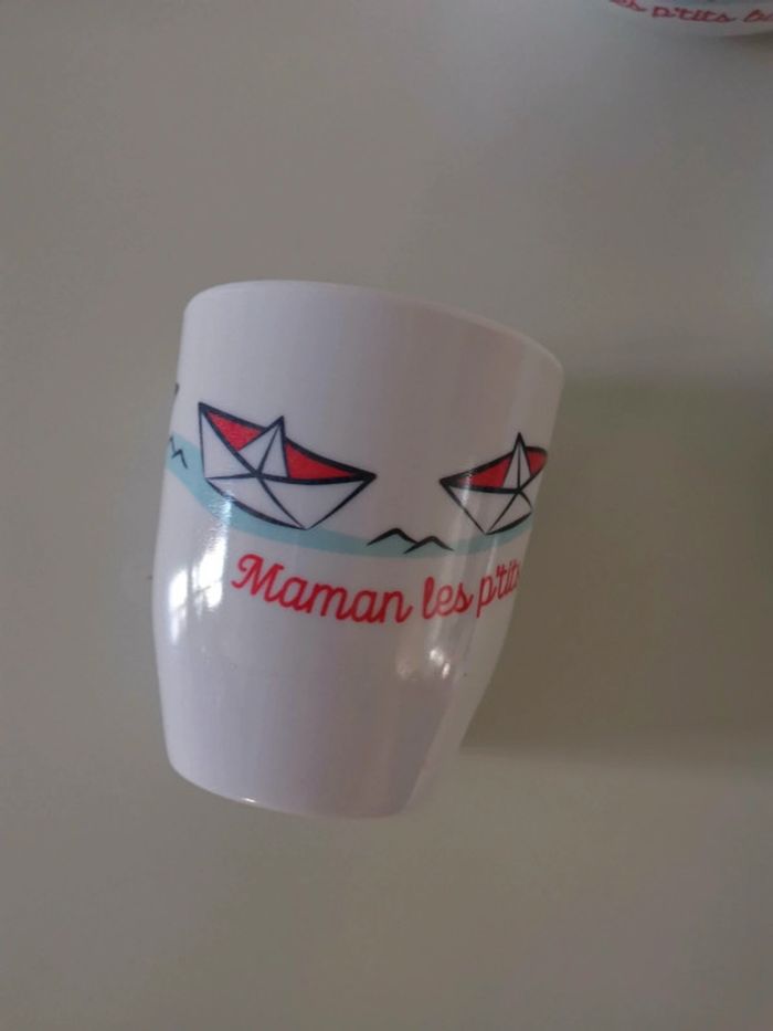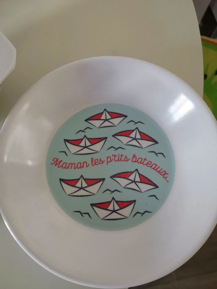 Joli lot vaisselle bébé "maman les ptits bateaux", un petit verre, un bol et une assiette En mélamine, donc vaisselle très résistante Passe au lave vaisselle, mais pas au micro-ondes Utilisé plusieurs fois