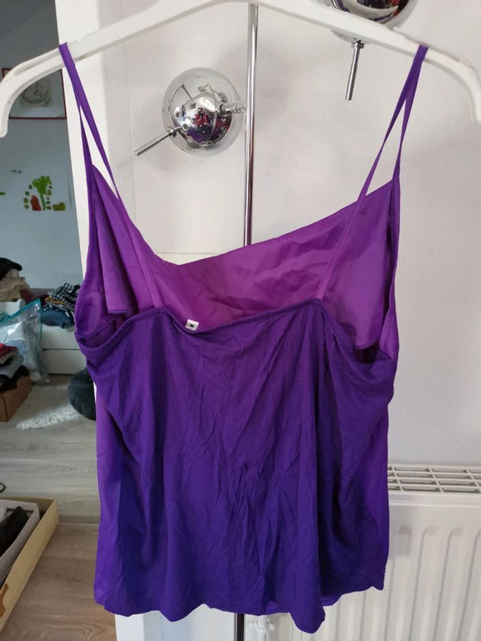 Débardeur fines bretelles, col bénitier, jolie couleur violine, taille bien Neuf avec étiquette 2 textures differentes : polyester devant et viscose à l'arrière