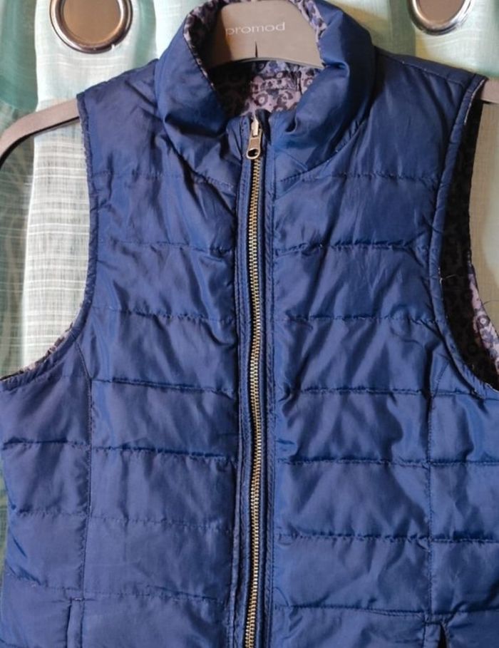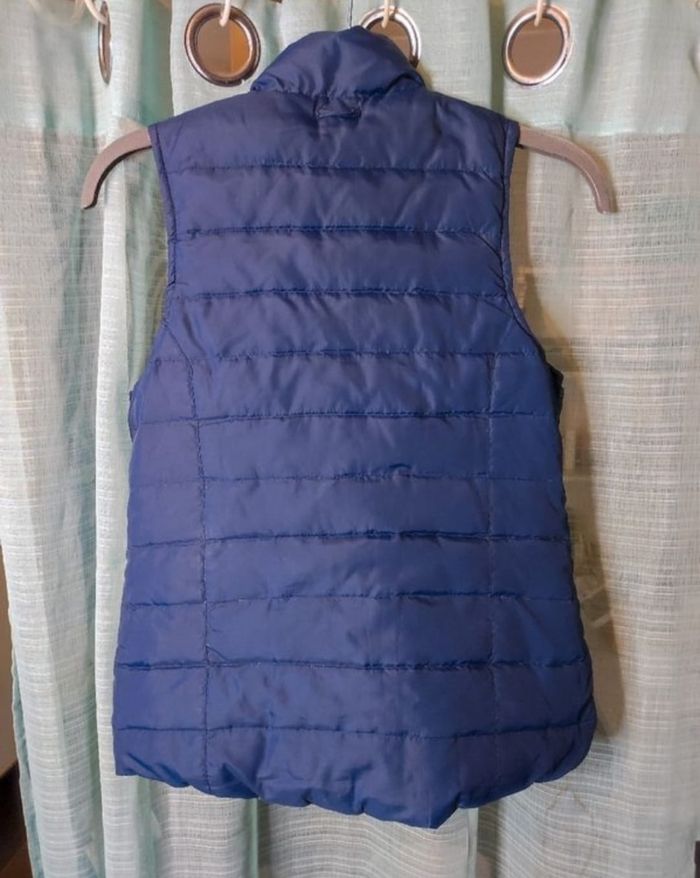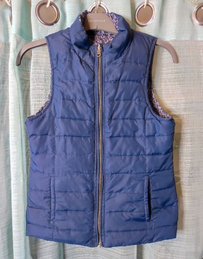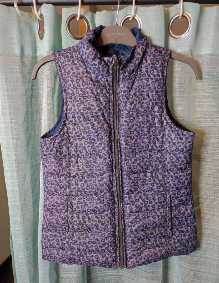 Veste sans manche réversible, un côté bleu marine et l'autre a motifs léopard. Taille non annoncer en étiquette mais convient du 10 au 12 ans. Intérieur en plume synthétique En très bonne état