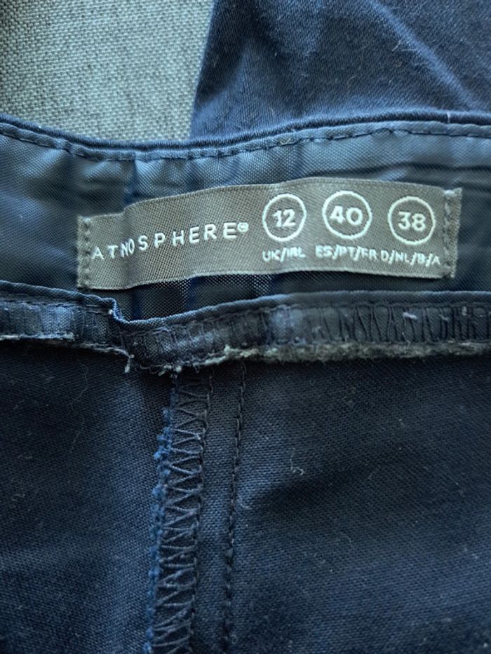 👭 Pantacourt se ferme avec un bouton , 1 crochet et une fermeture éclair 📏 taille : 40 🏷 De la marque : Atmosphère 🌈 couleur : bleu marine ✔️ Pantacourt déjà porté encore en bon état