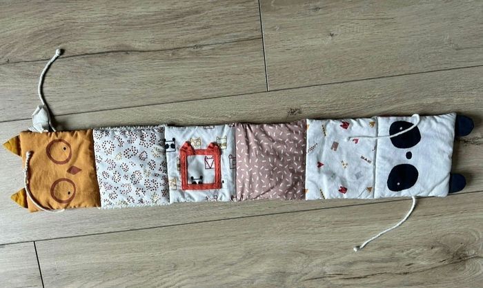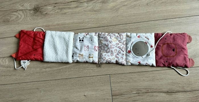 Jeu d'éveil en tissu avec différentes textures et bruits . Possibilité de mettre une petite photo dans un cadre . Le miroir un peu abîmé . Aucune tâche , ni trou. Possibilité d'être accroché au lit ou au parc