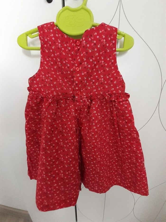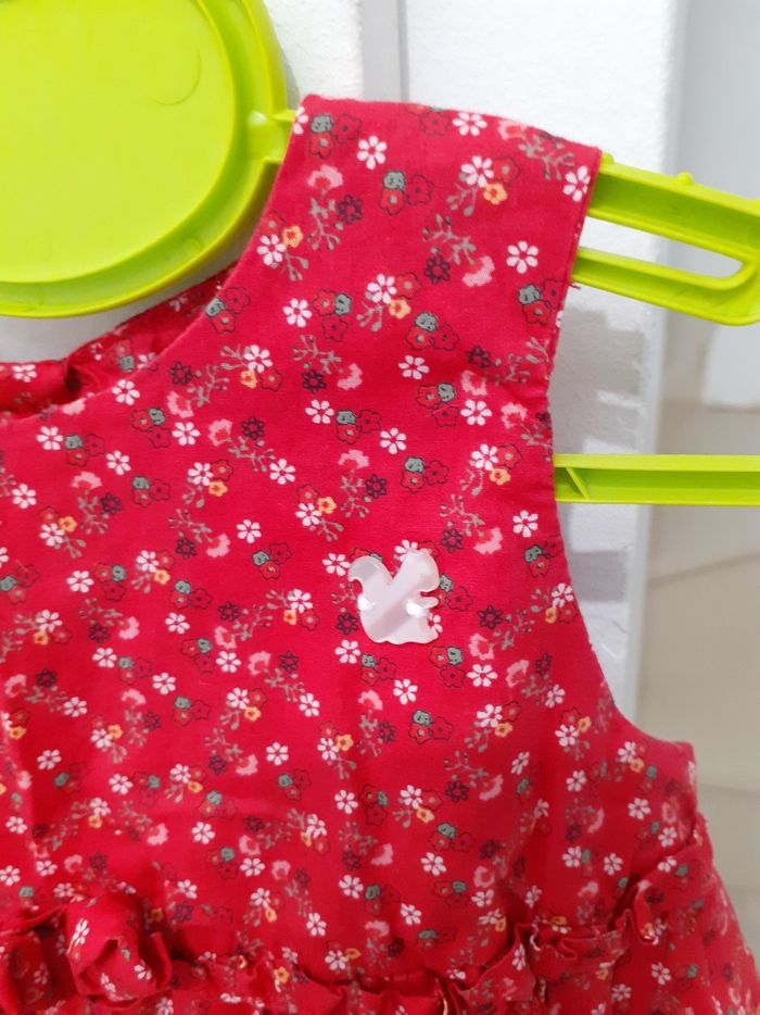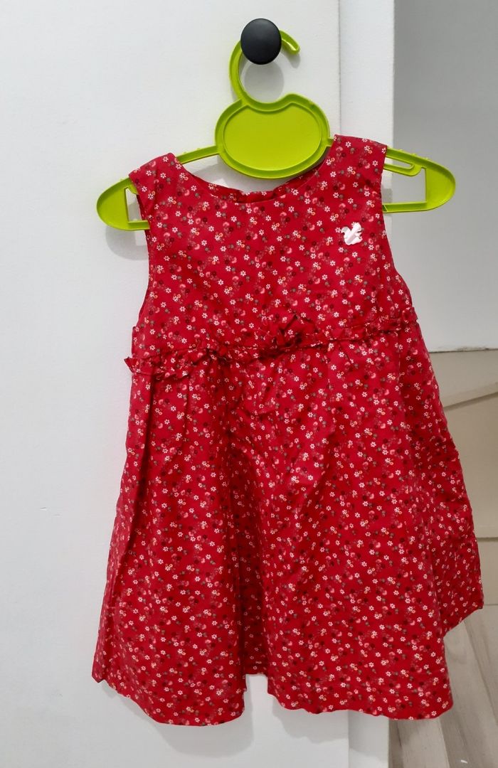 Très bon état jolie robe rouge motif petites fleurs sergent major. Petit oiseau nacrée niveau poitrine. 12 mois.