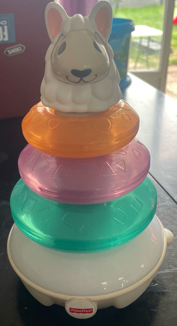 Jeu éducatif qui peut de synchroniser avec les autres animaux de la marque Fisher Price. Fait de la musique. A très bien servi pour nos enfants et peut encore servir pour le plaisir des autres enfants.