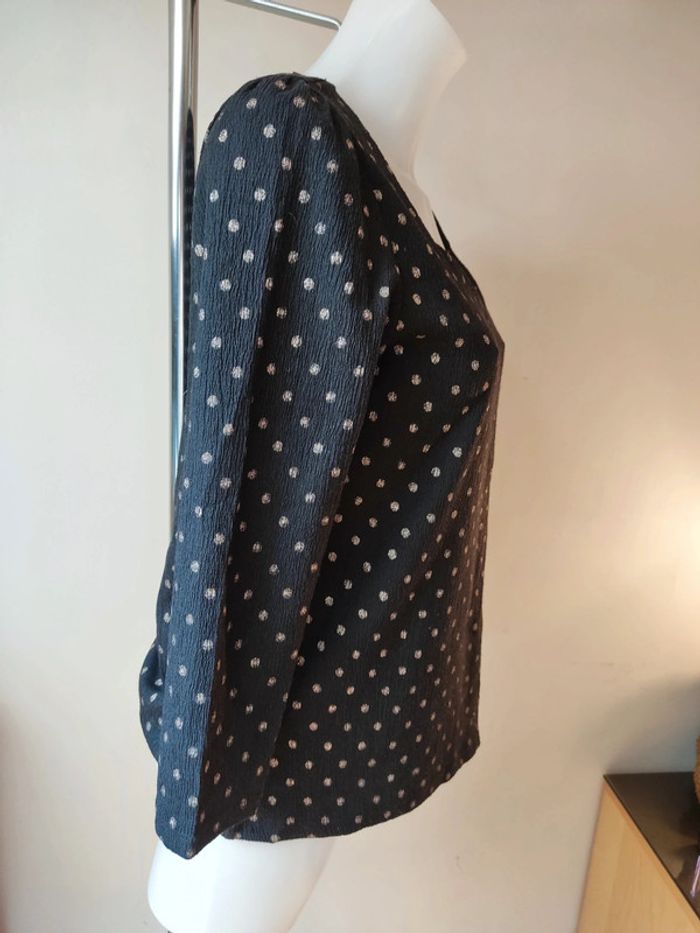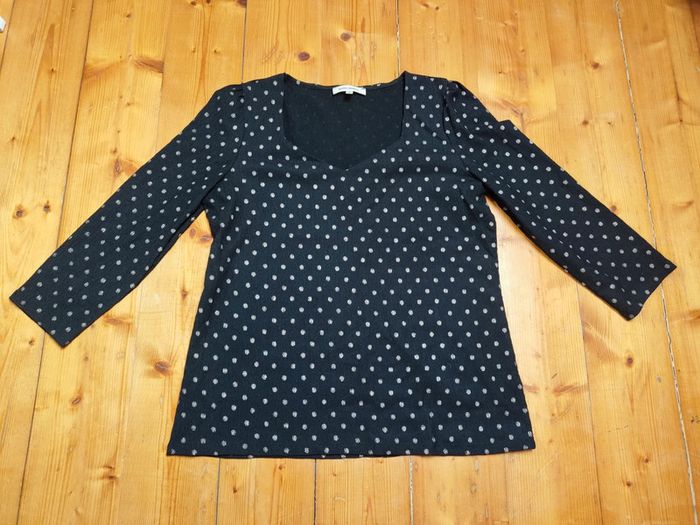 En très bon état. Joli haut manches 3/4 matière crêpe , coloris noir et points dorés. Marque Grain de Malice taille M ⚠️ Je fais des envois via tous les points relais sauf Colissimo !!! #graindemalice38 #hautmanchestroisquart